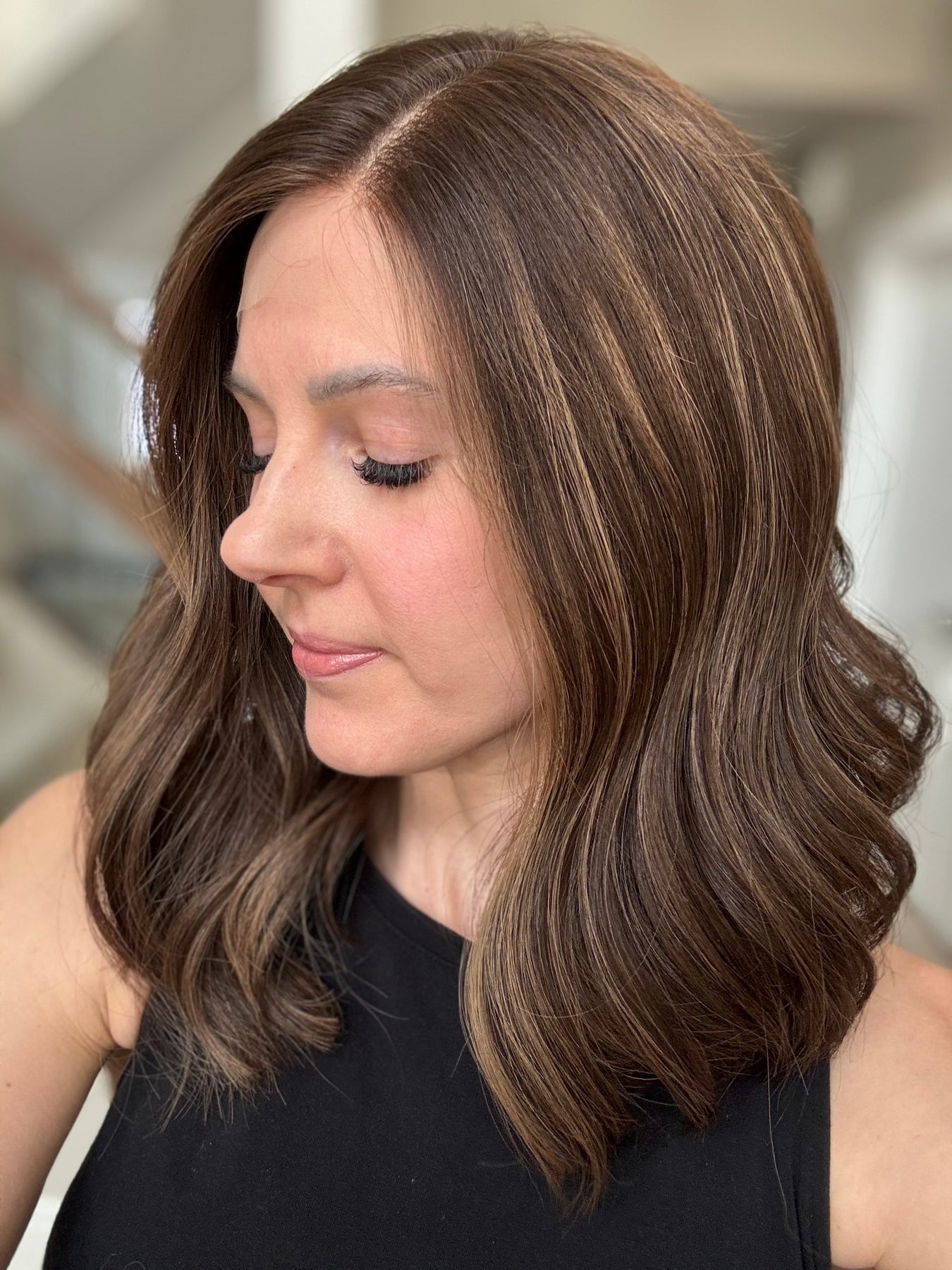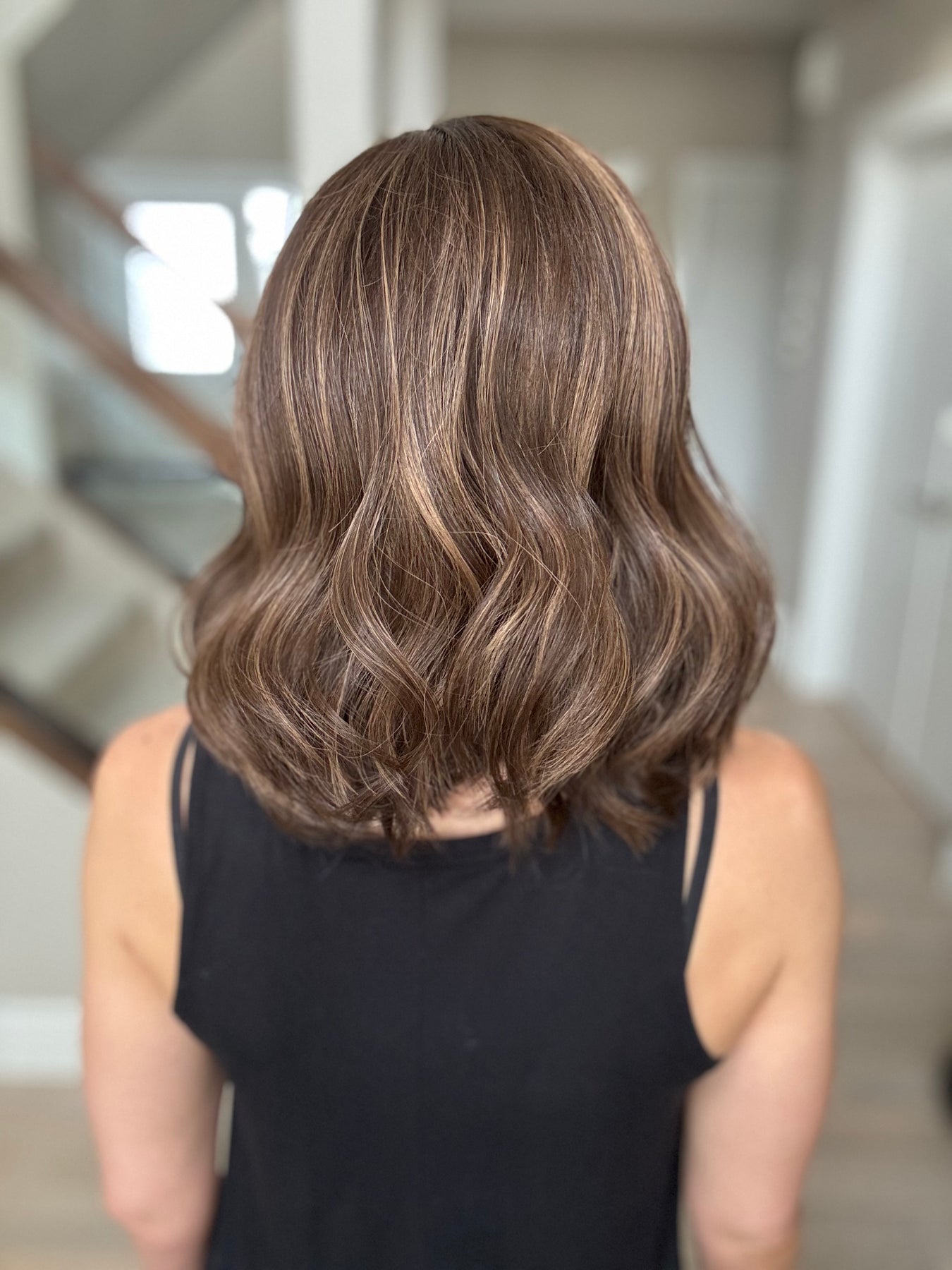 * Color: Dark brown with caramel balayage.