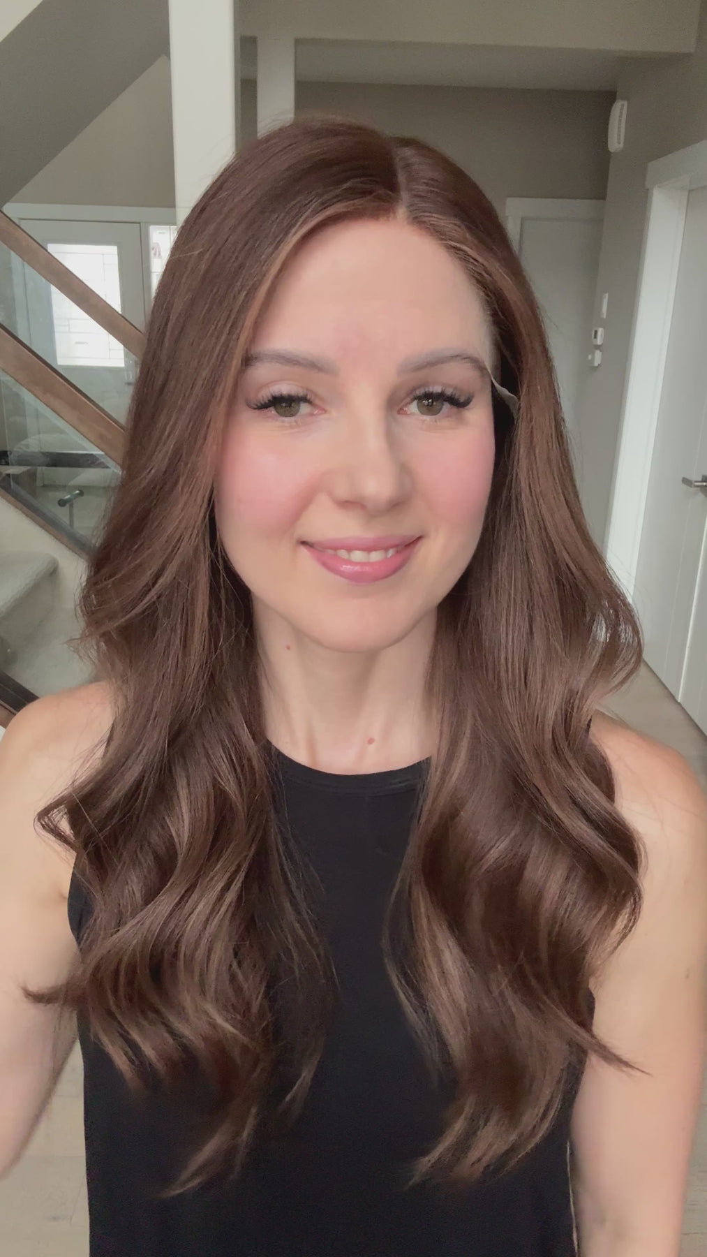 * Color: Medium brown with warm undertones and soft caramel balayage.