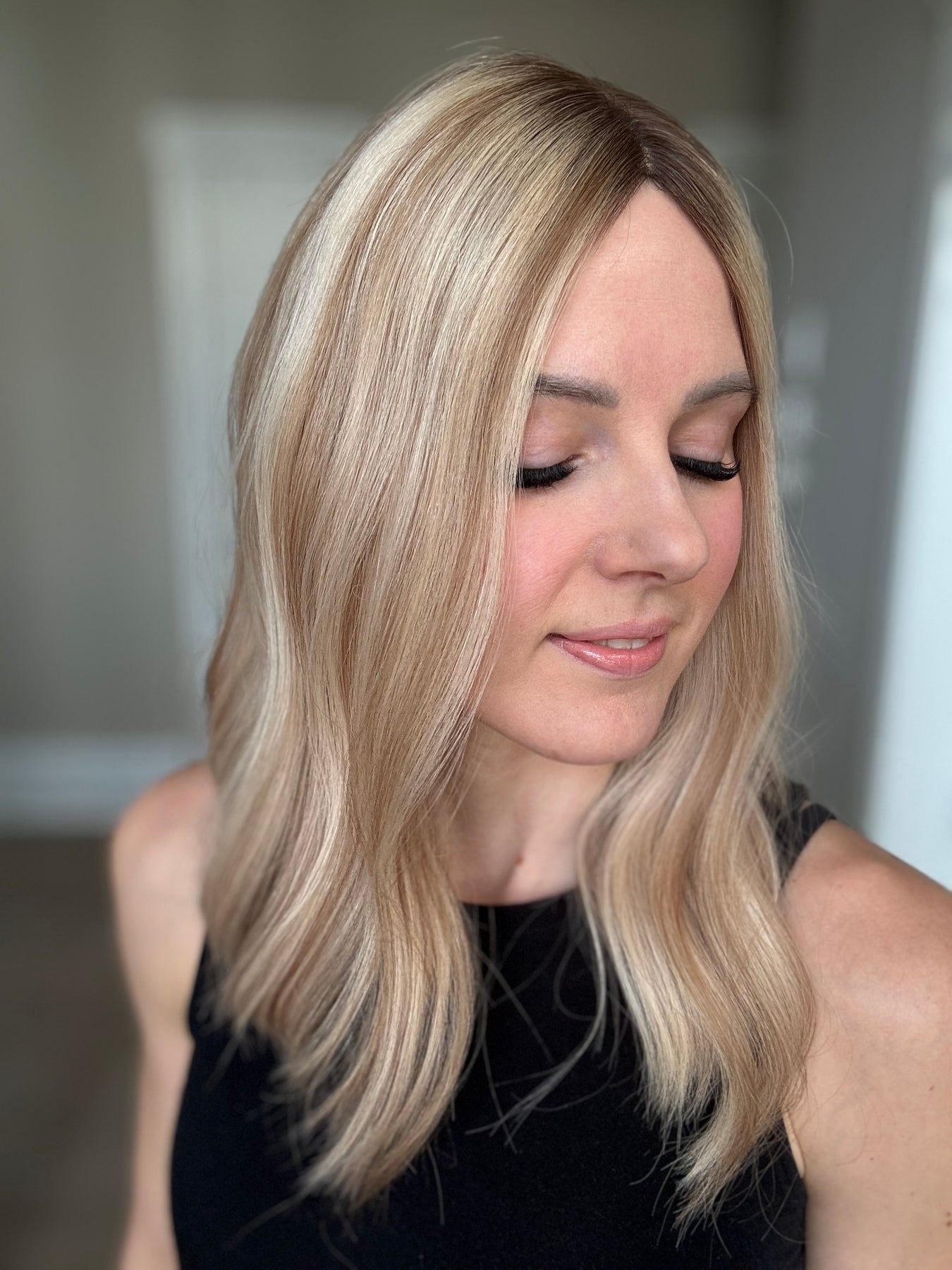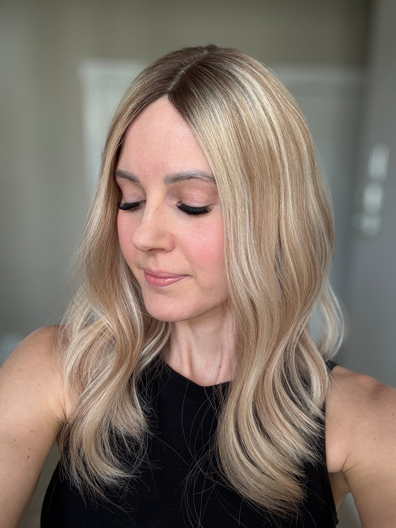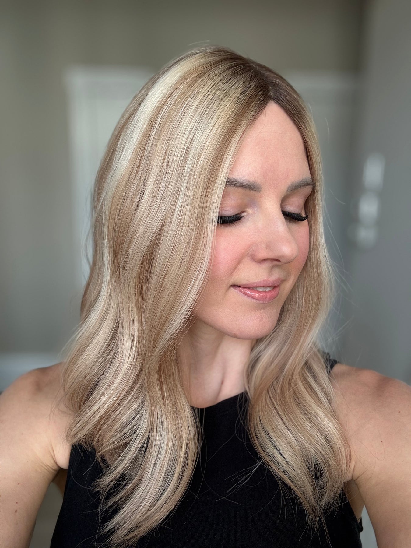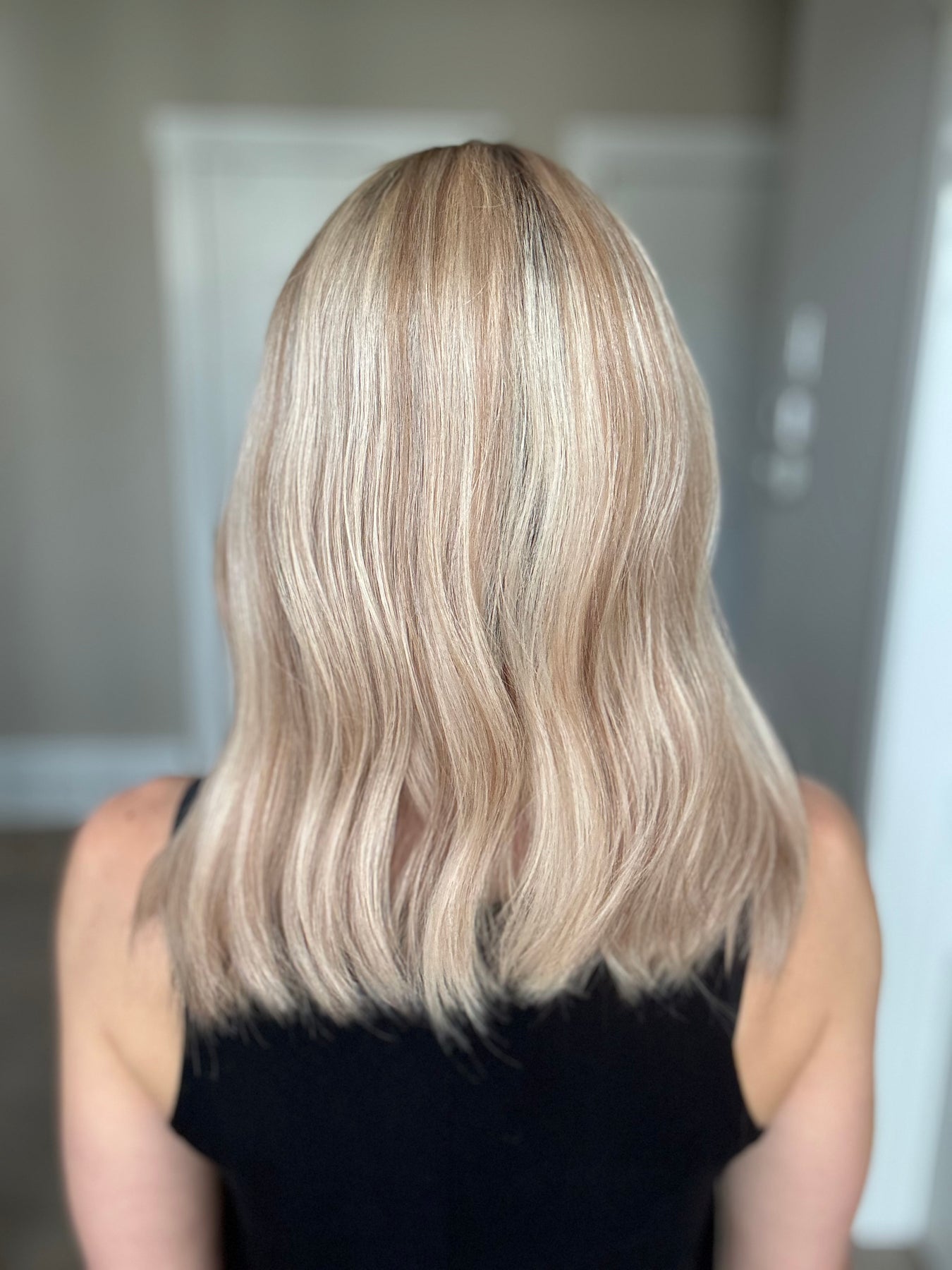 Color: Neutral light blonde with dark blonde lowlights and medium brown rooting.
