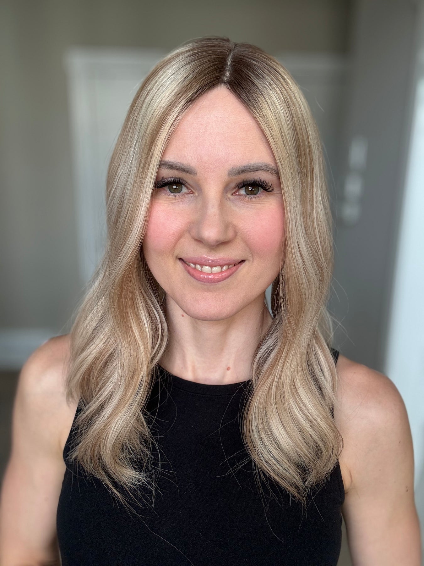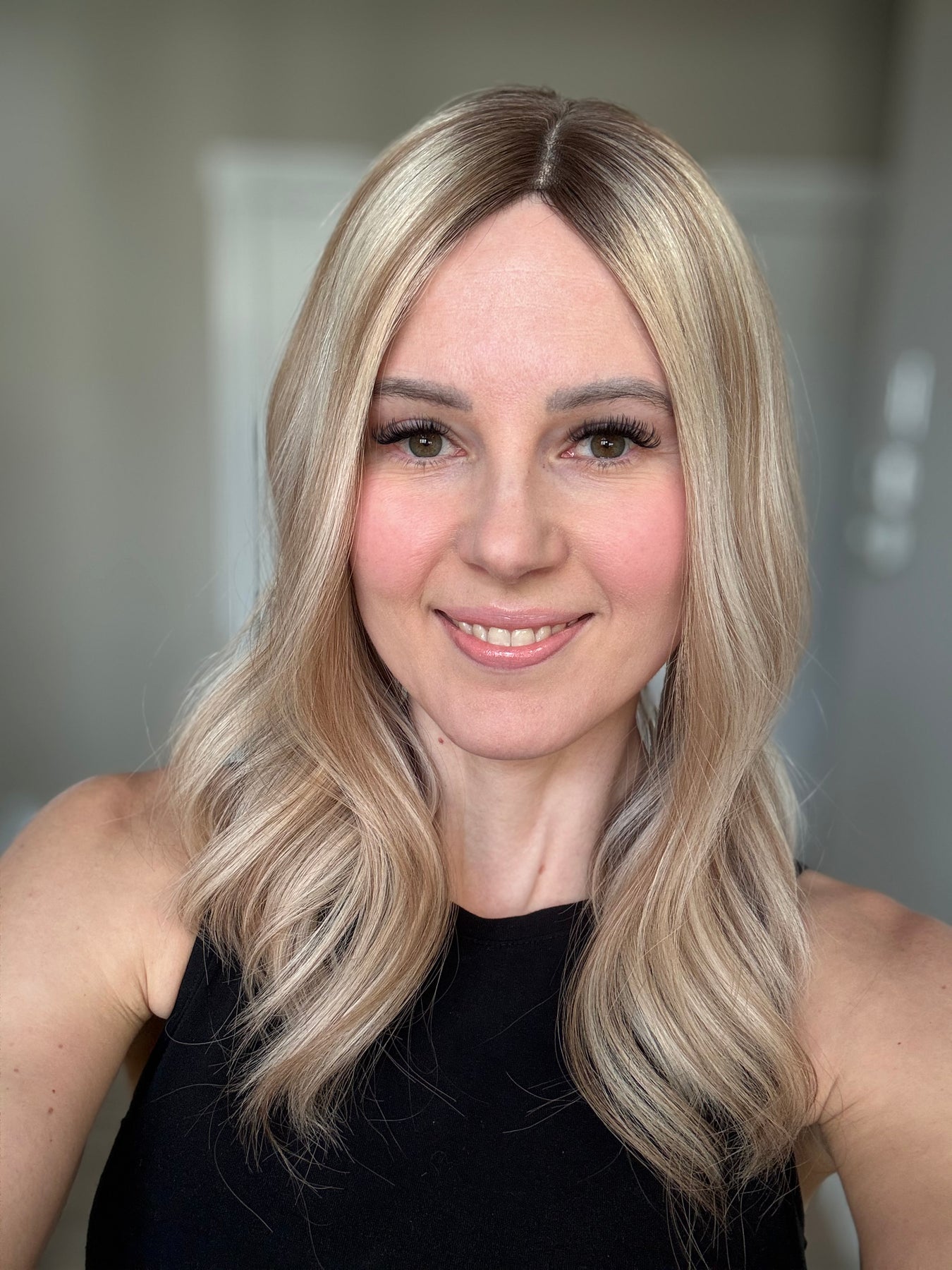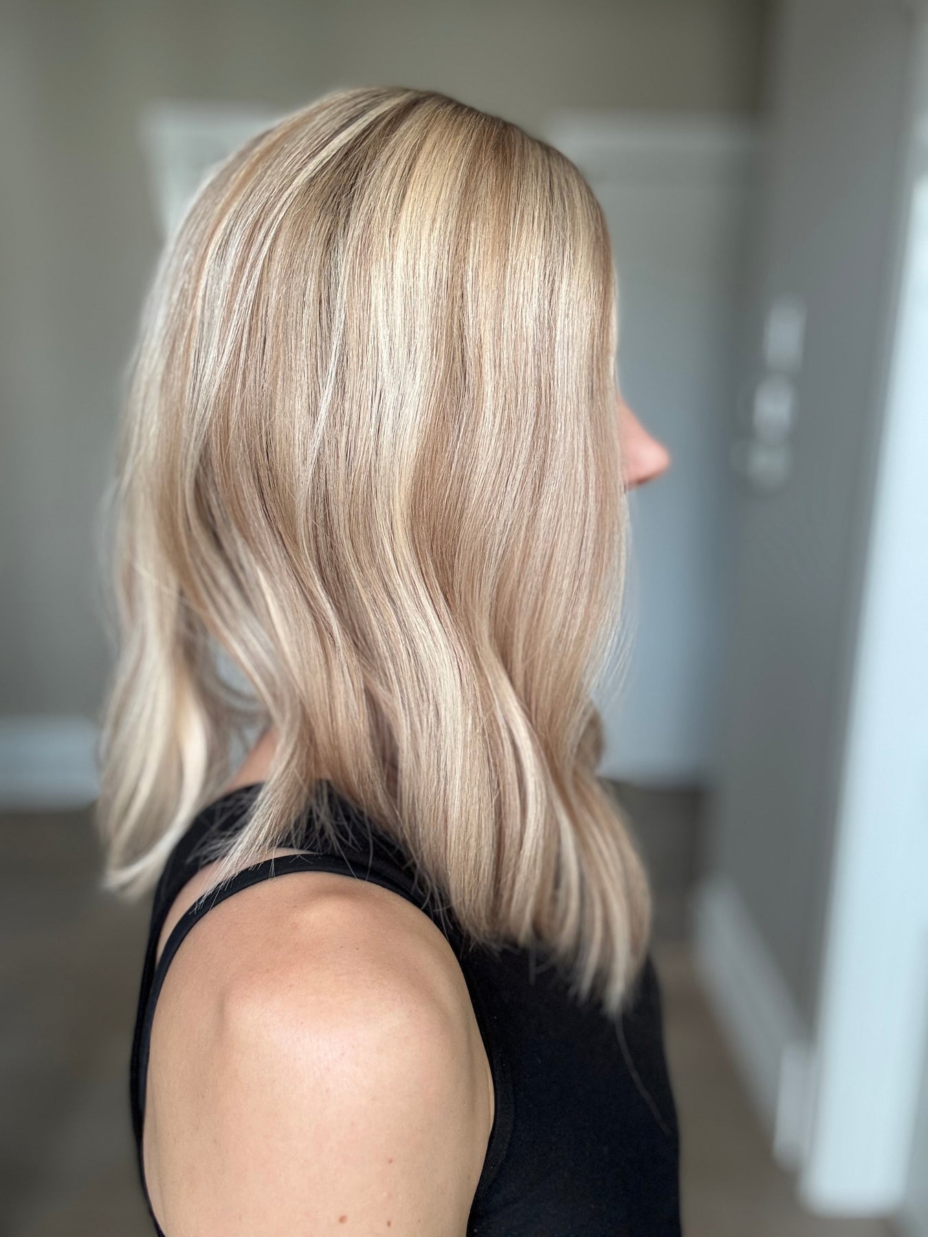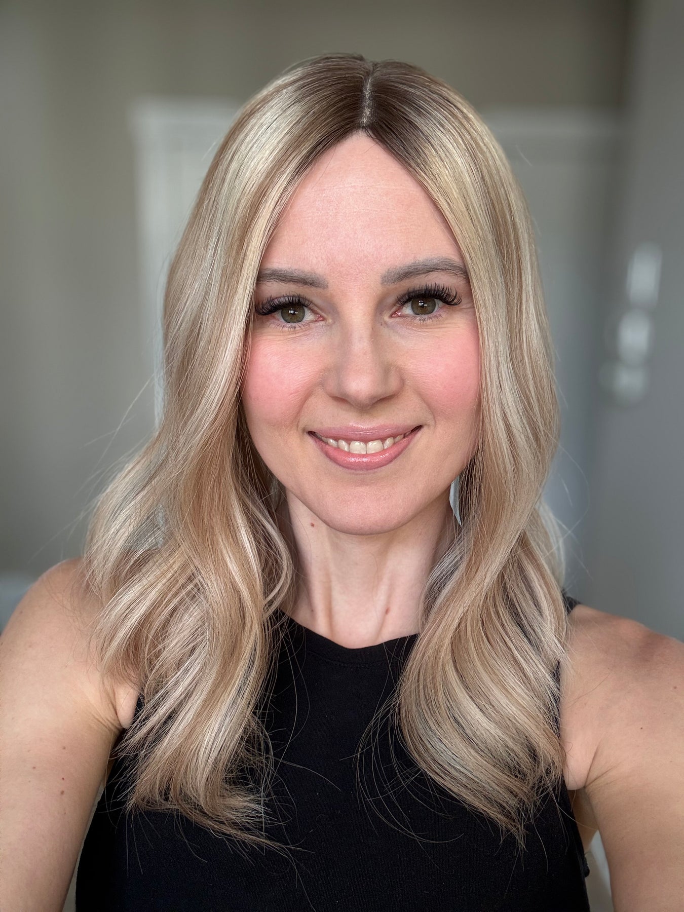 Color: Neutral light blonde with dark blonde lowlights and medium brown rooting.