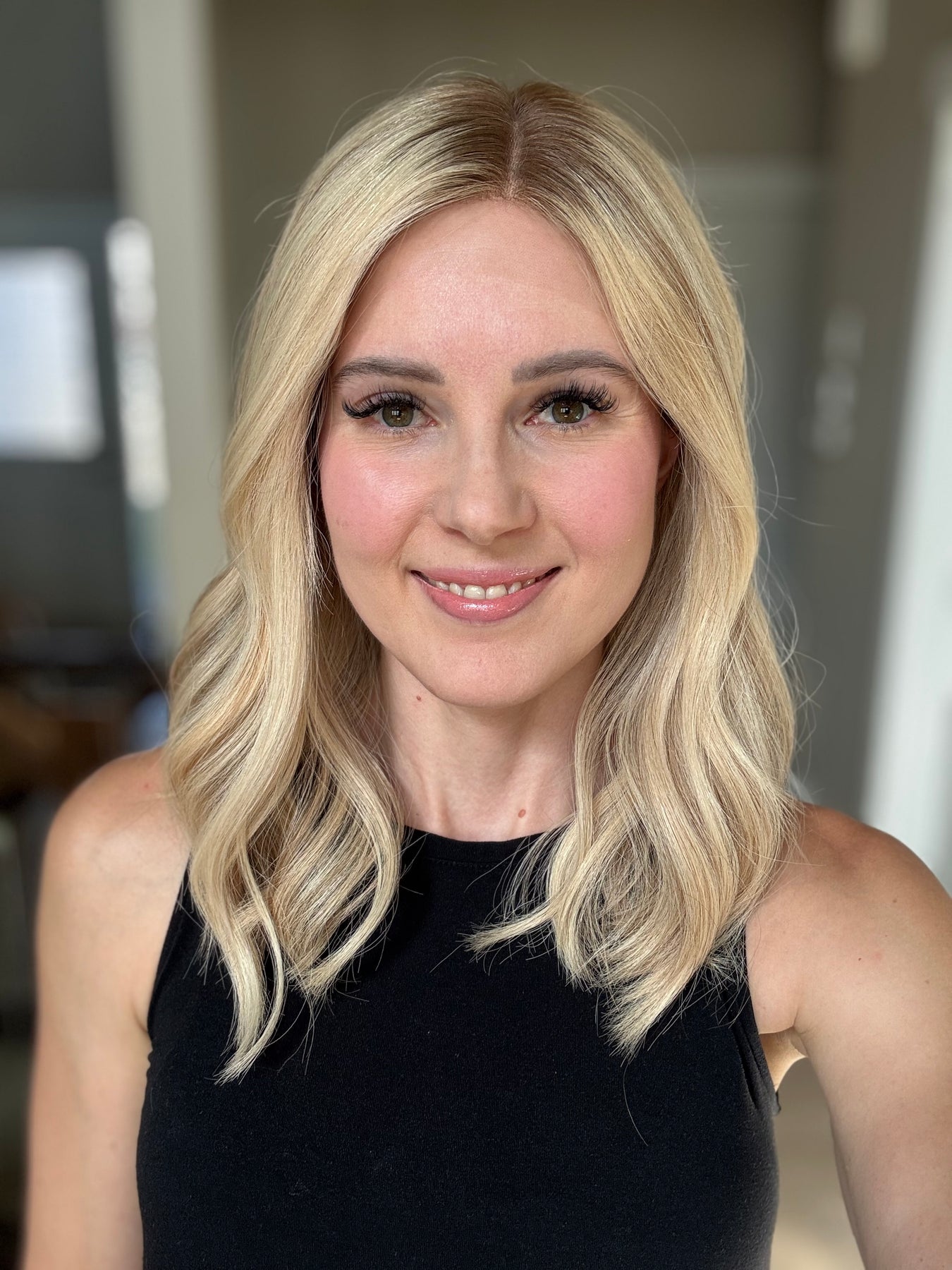* Color: Warm light/medium dimensional blonde with dark blonde roots.