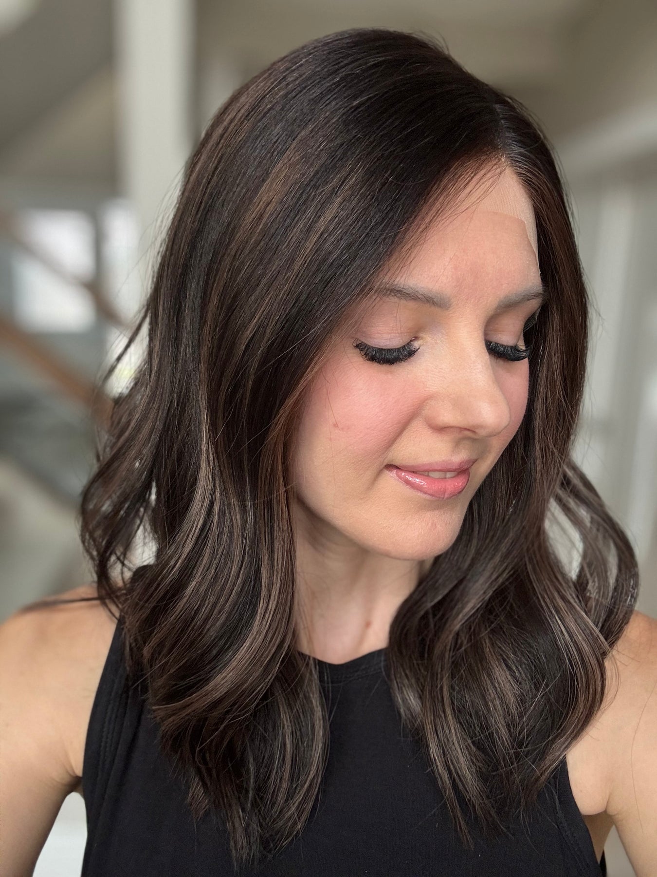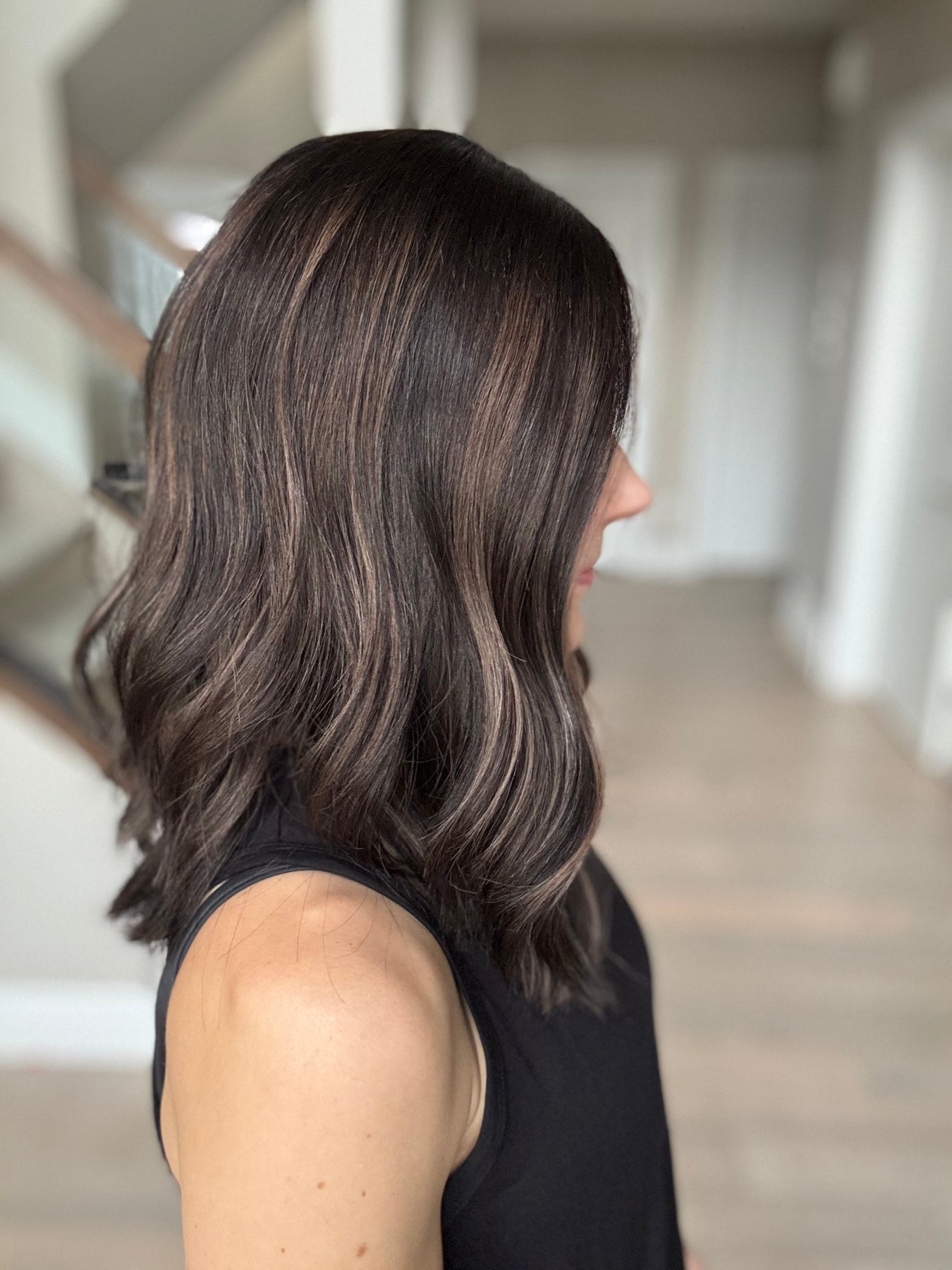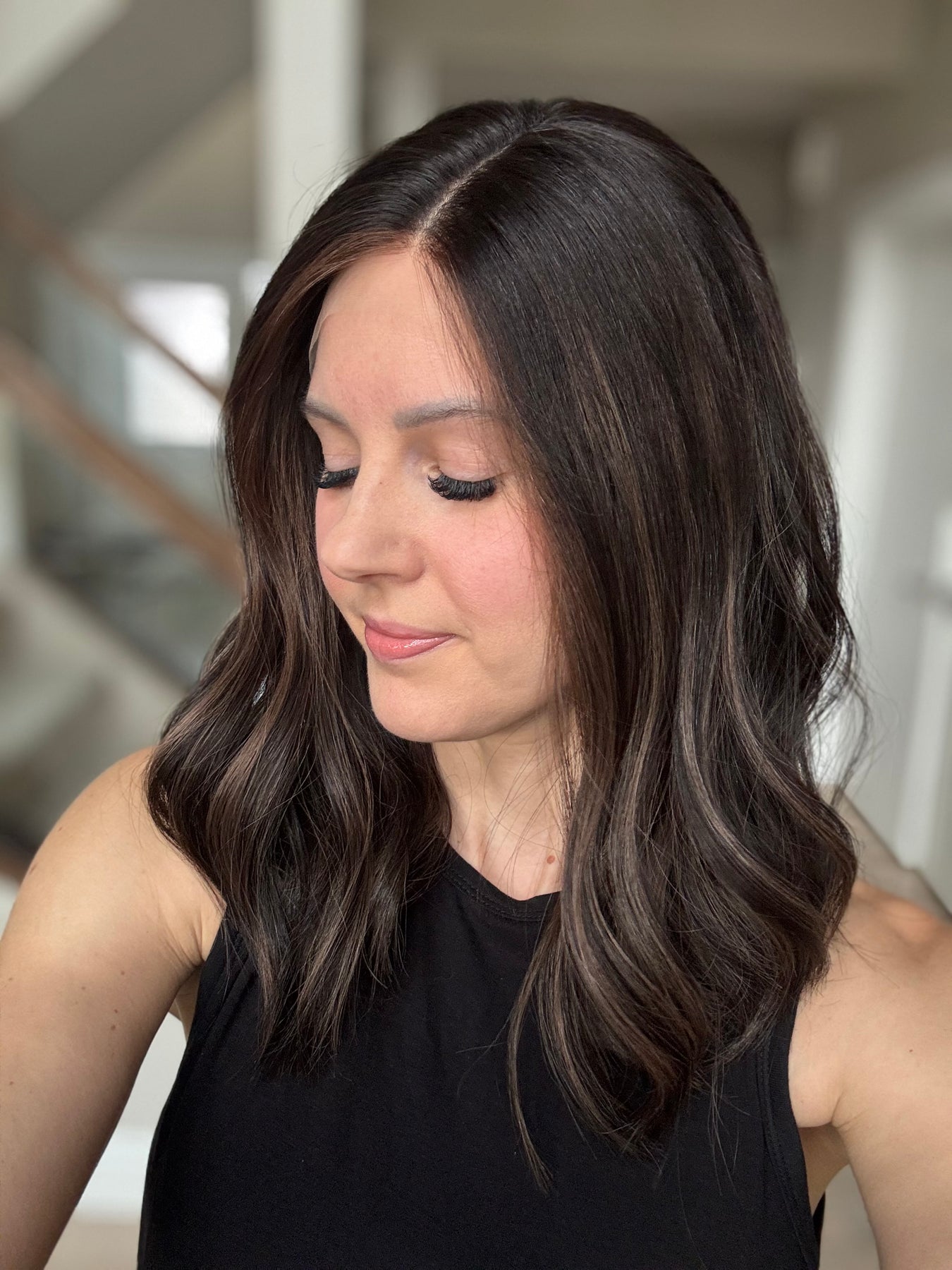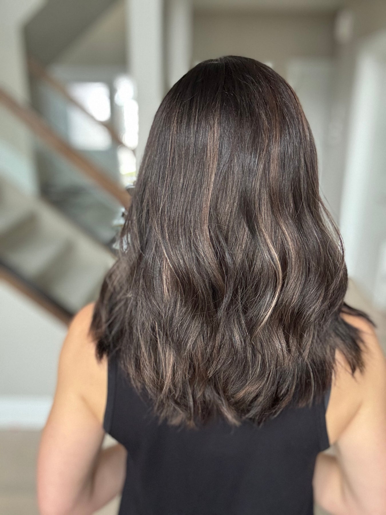 * Color: Black base with dark caramel balayage.