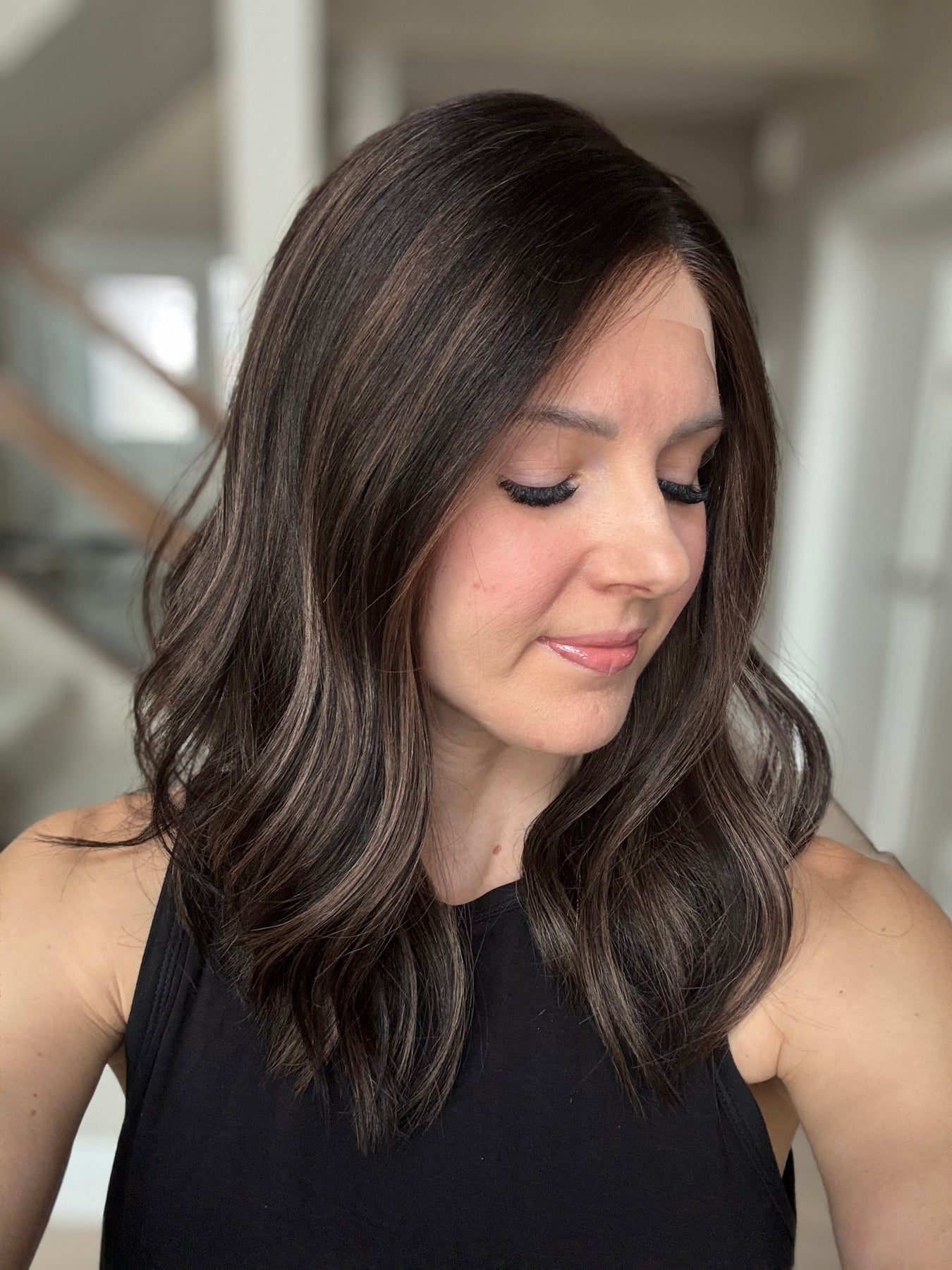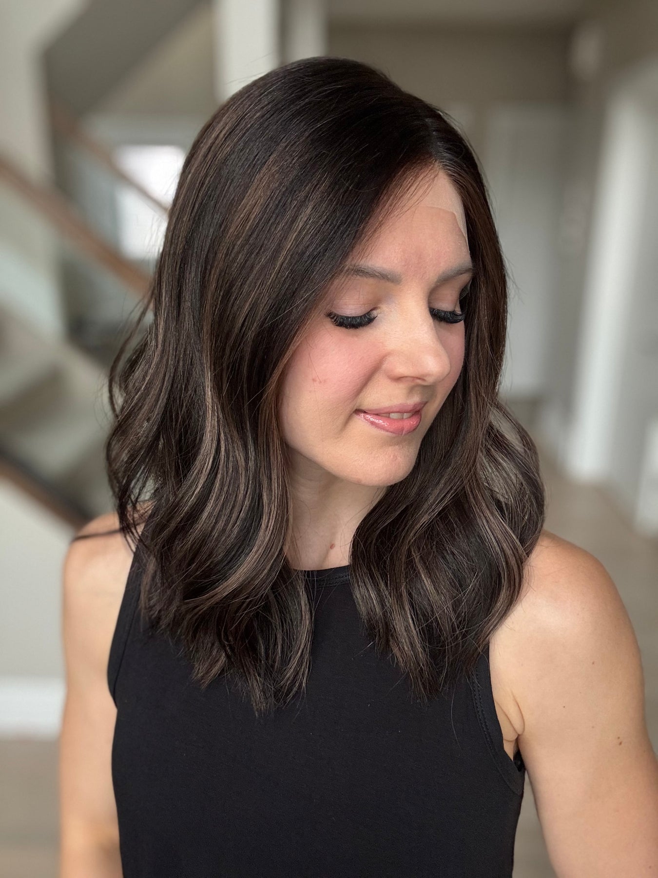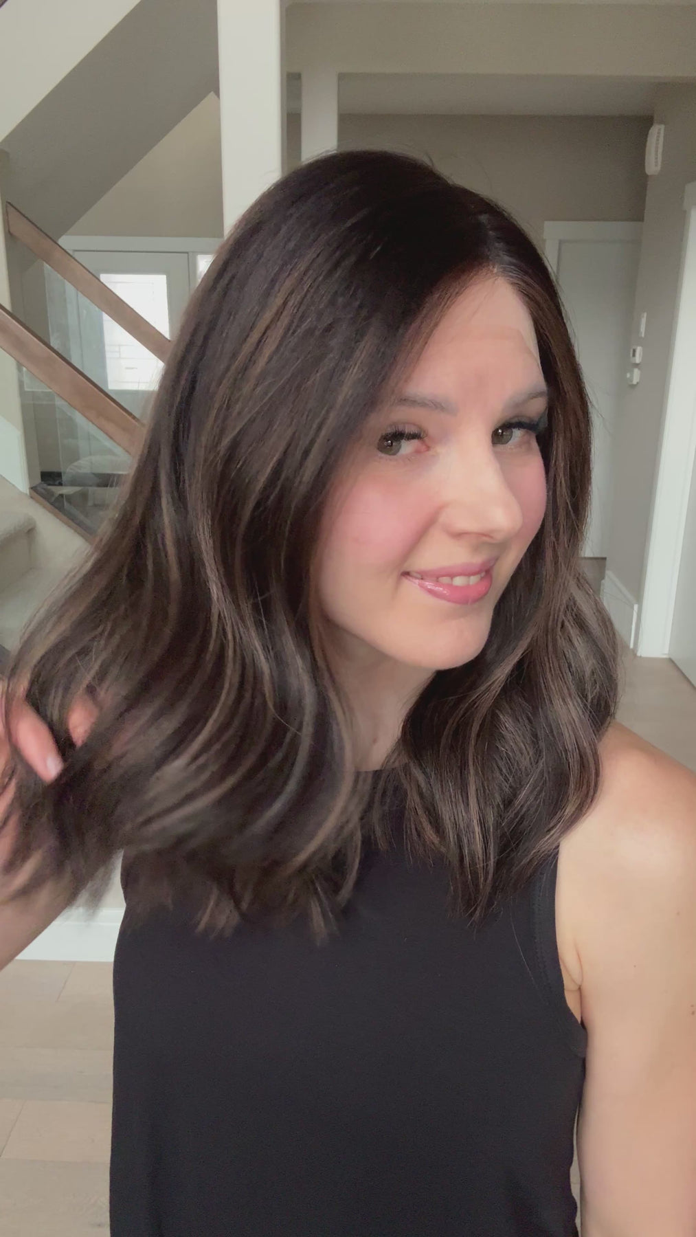 * Color: Black base with dark caramel balayage.