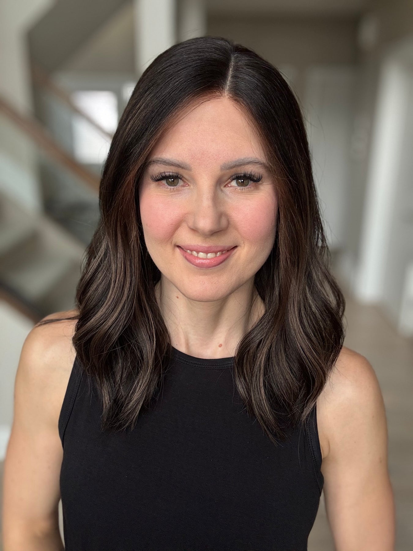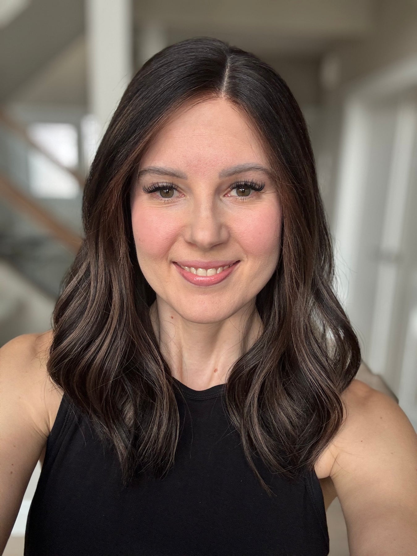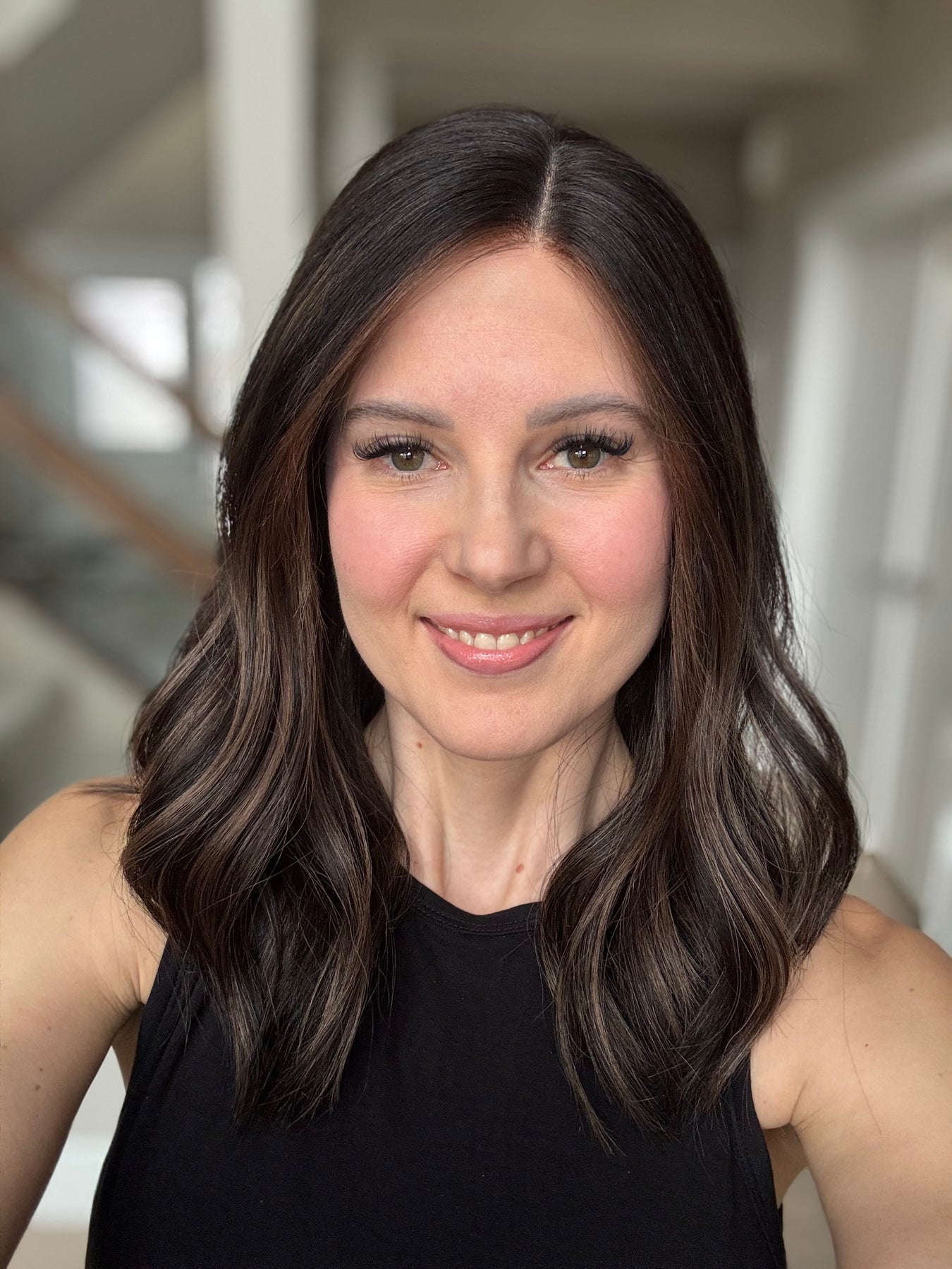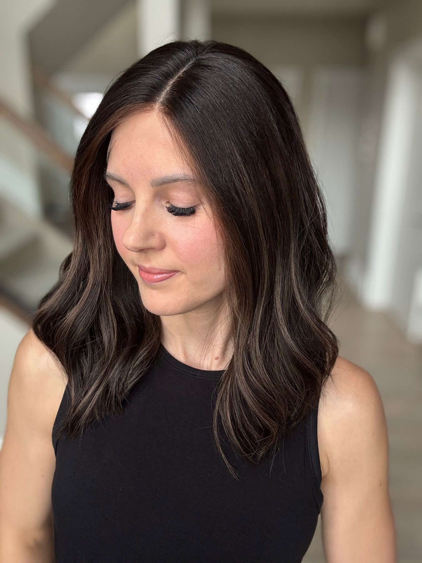 * Color: Black base with dark caramel balayage.