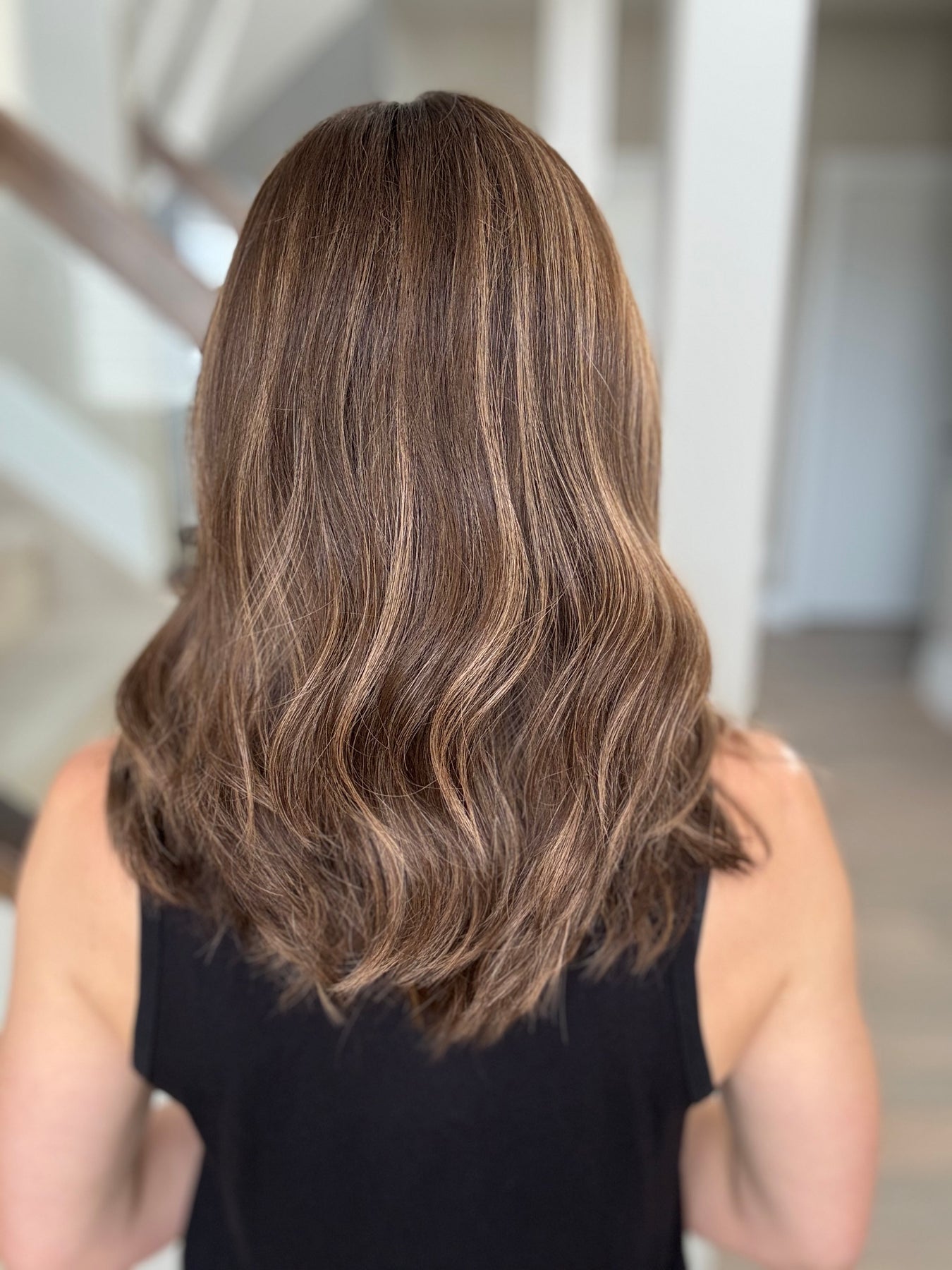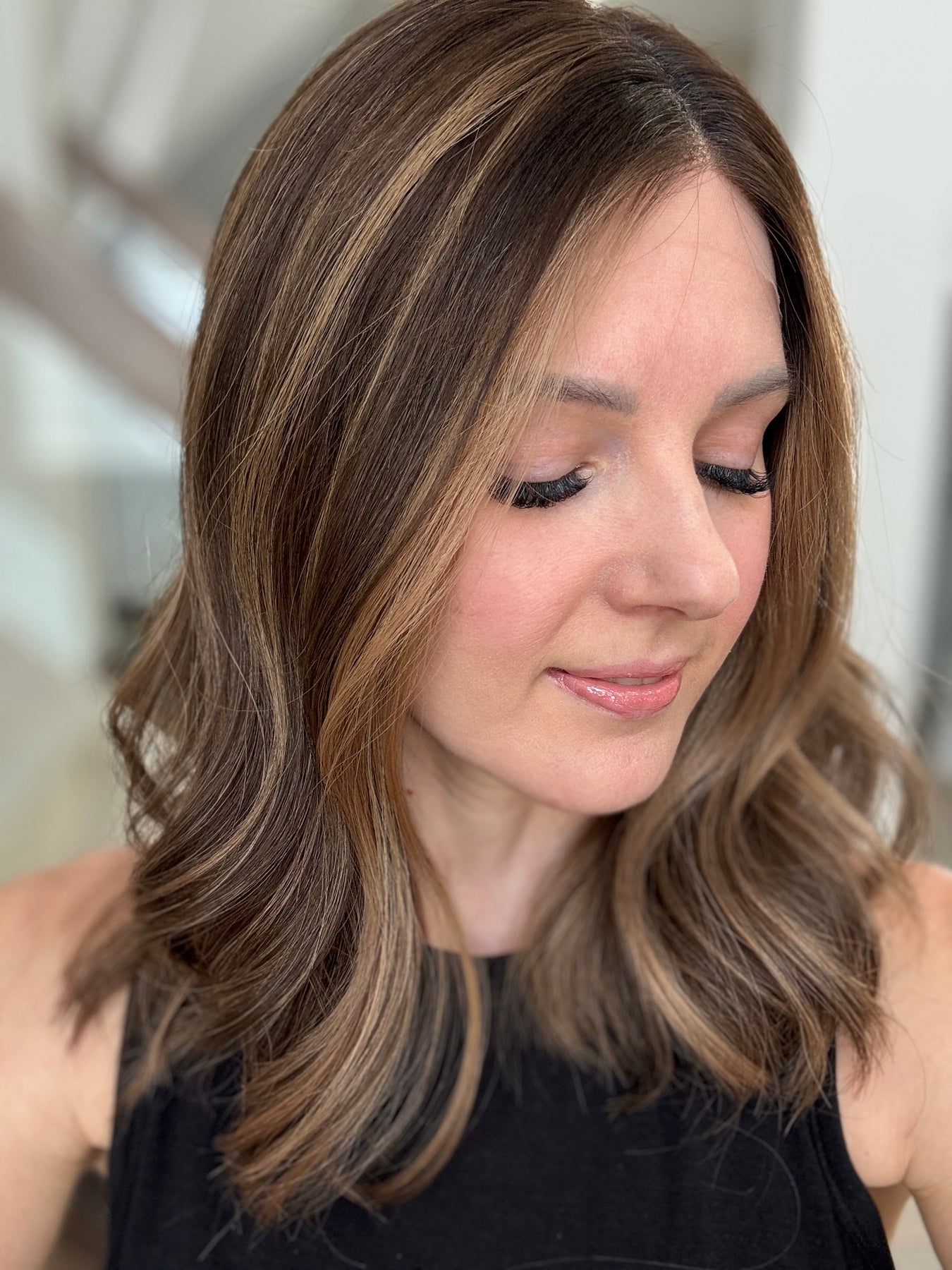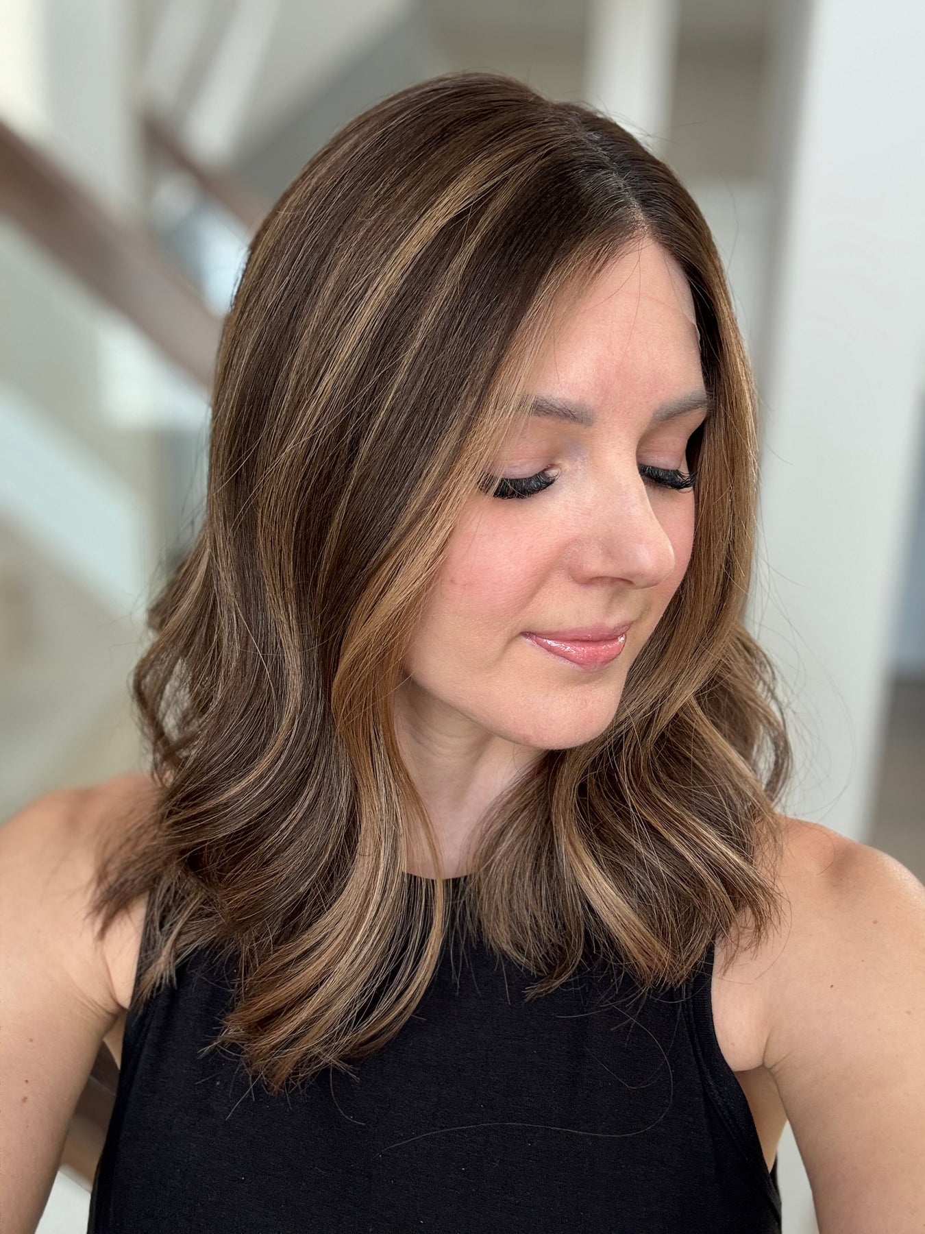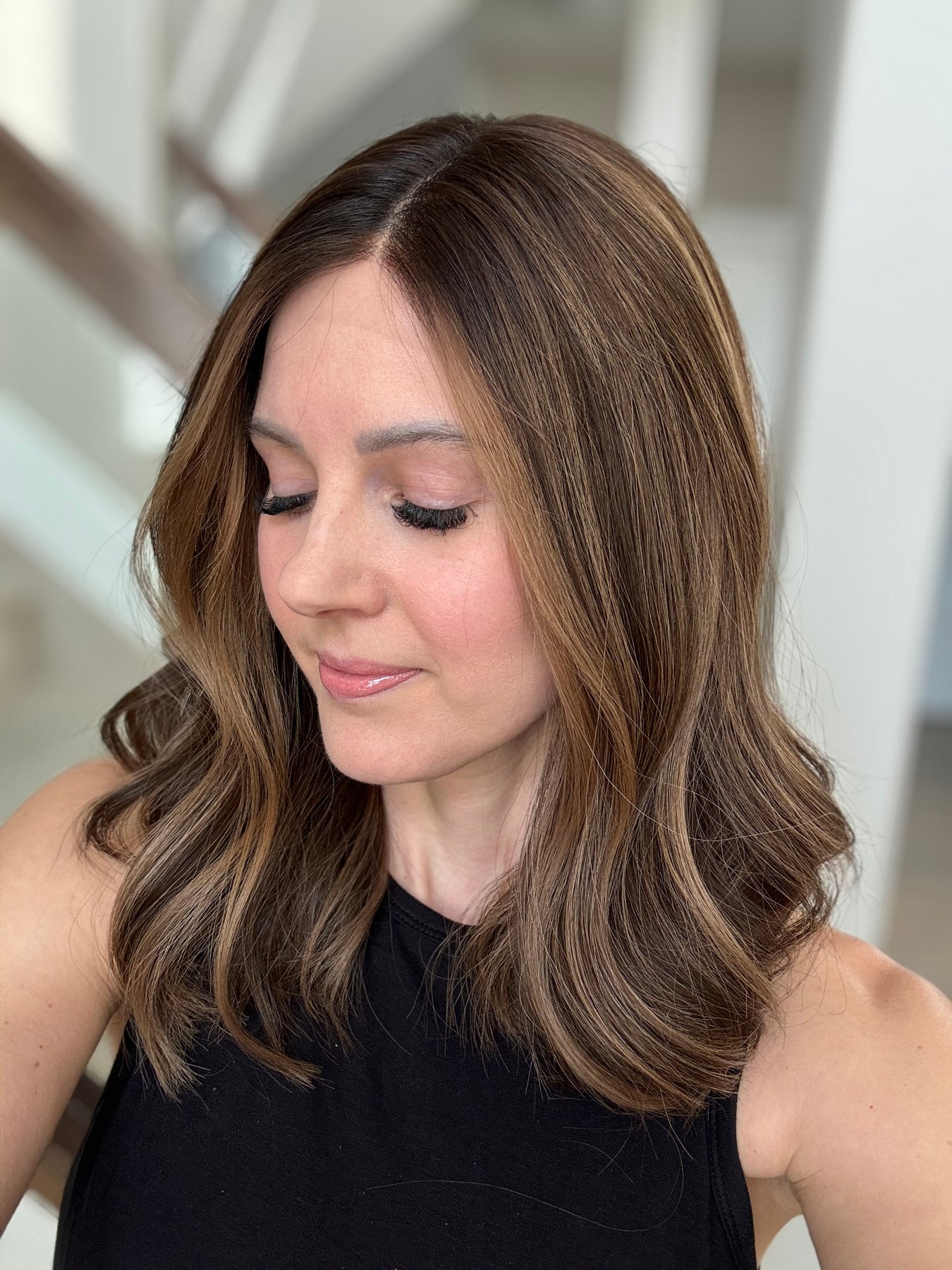 * Color: Dark brown with caramel balayage and a slightly darker rooting.