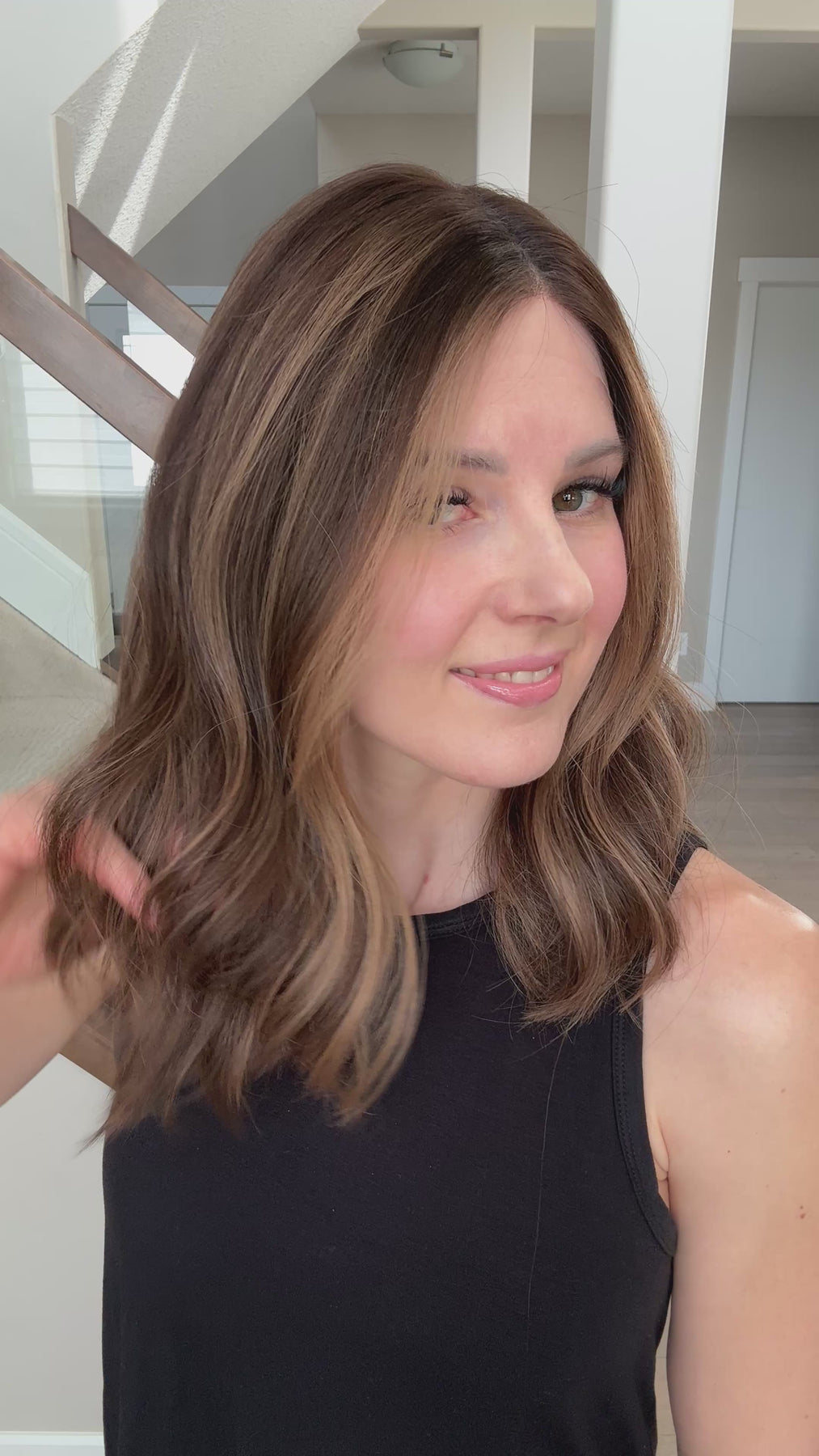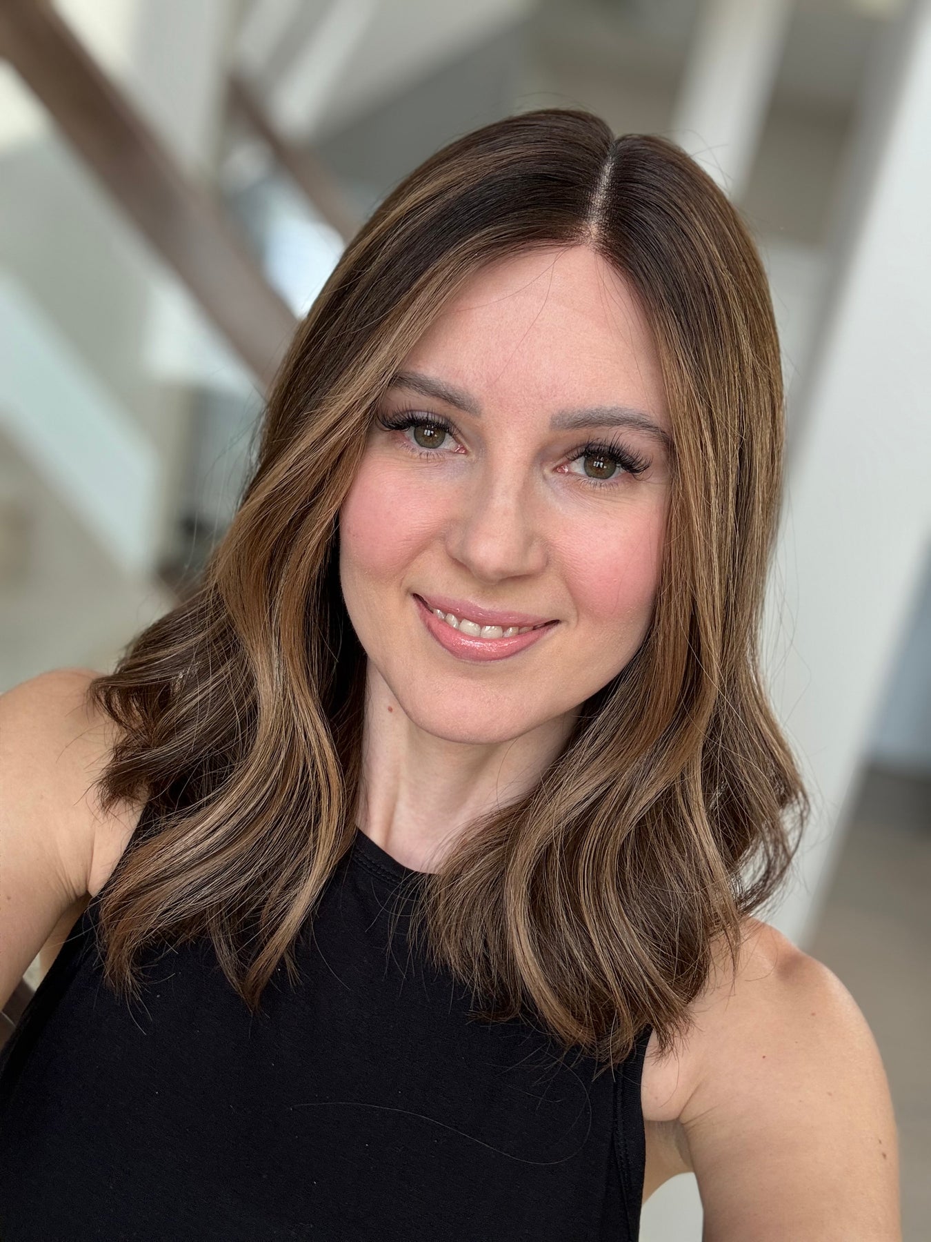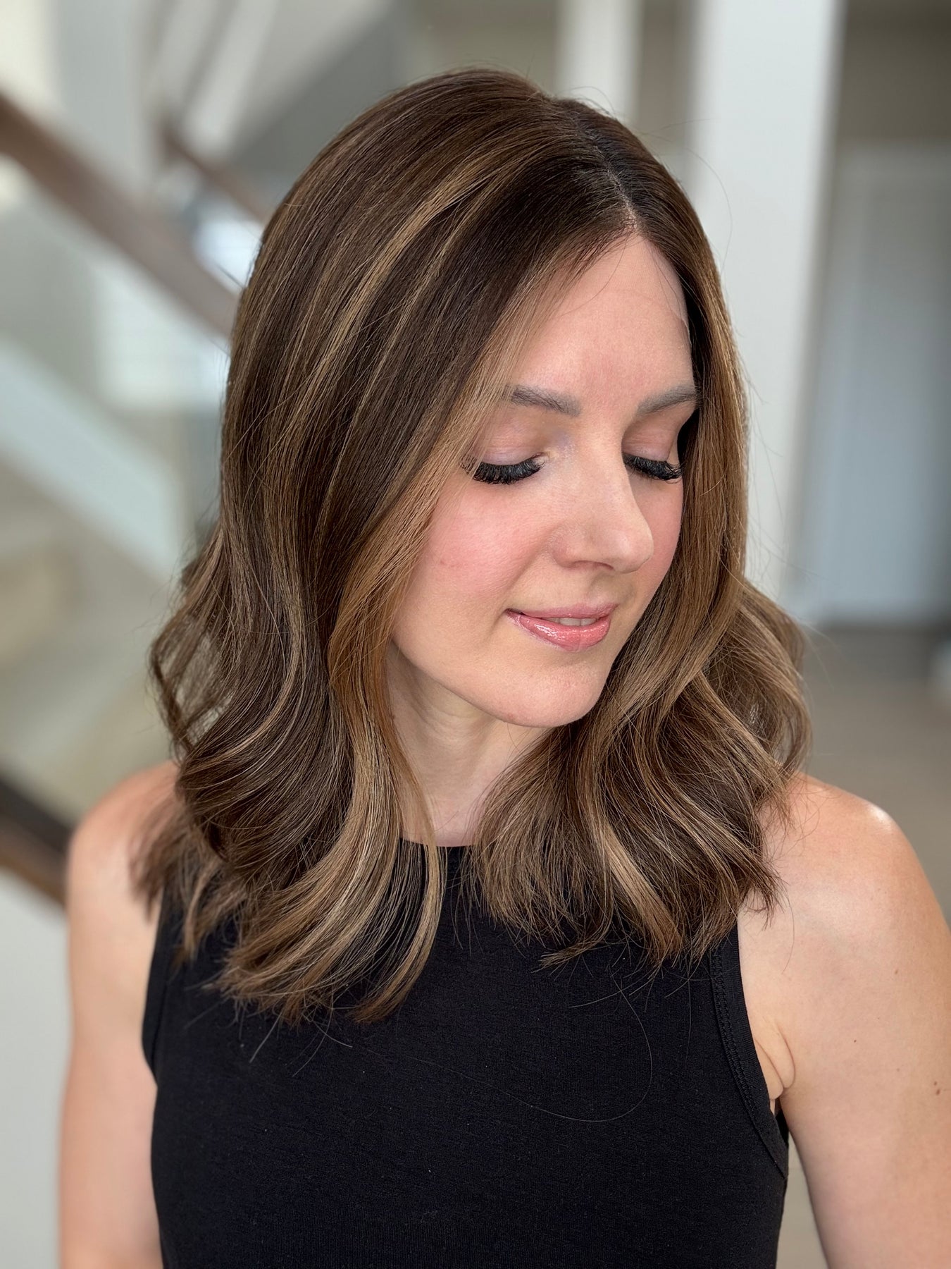 * Color: Dark brown with caramel balayage and a slightly darker rooting.