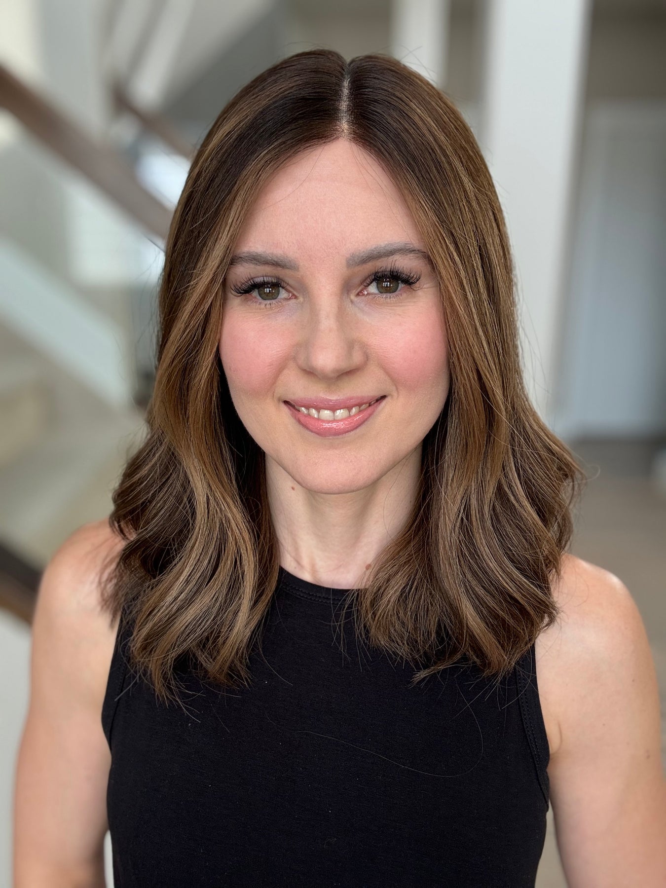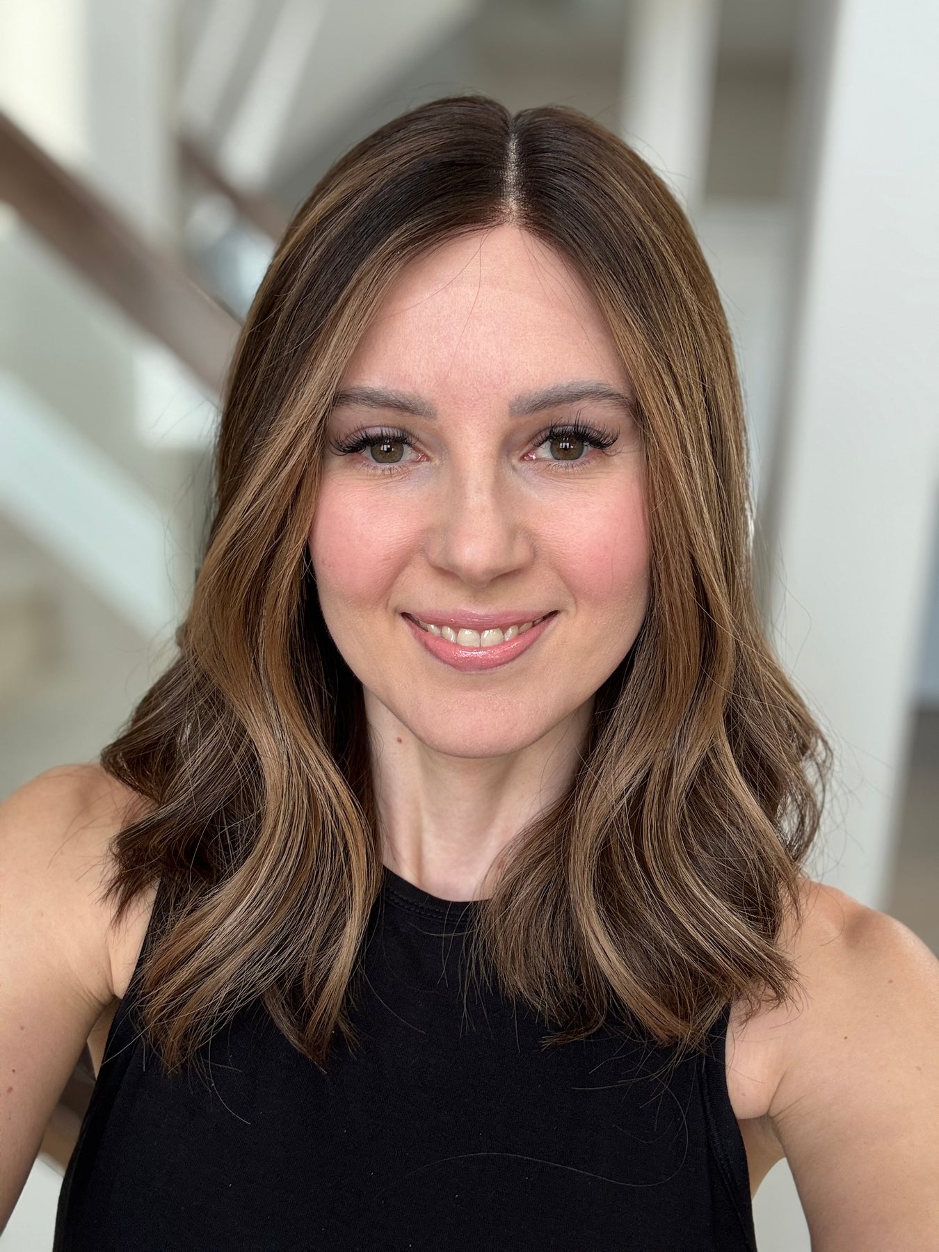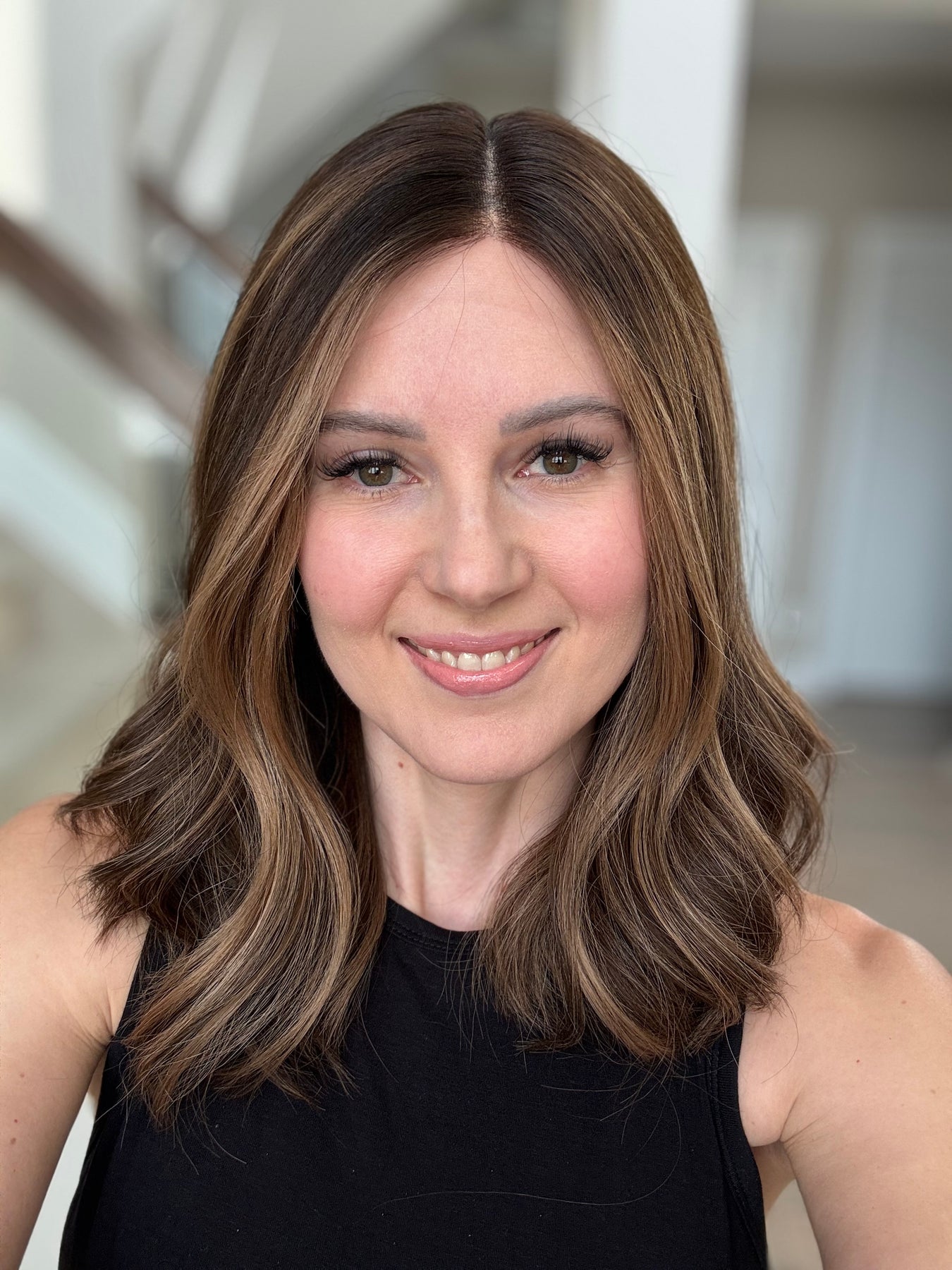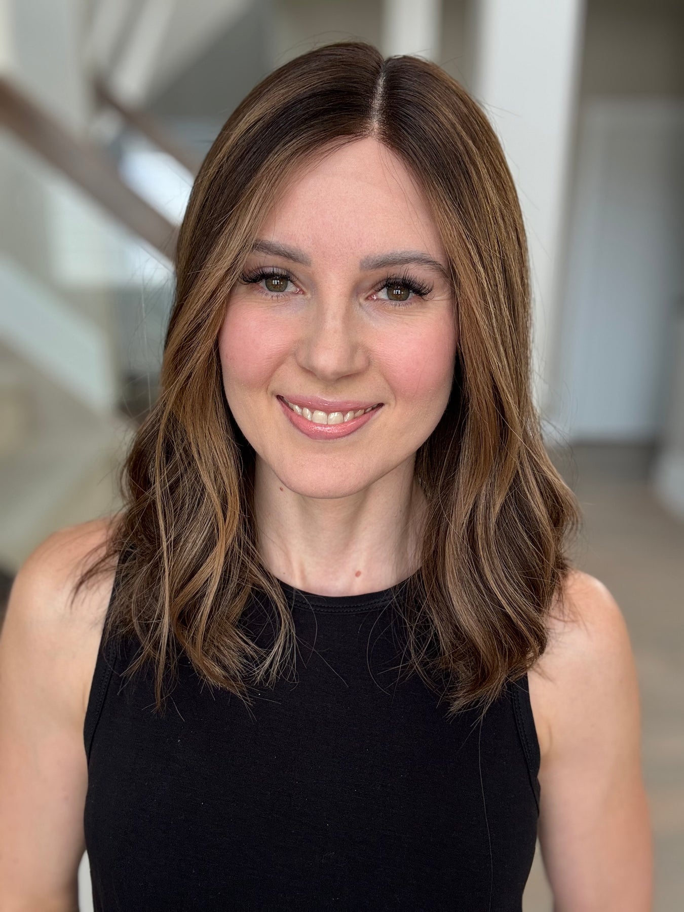 * Color: Dark brown with caramel balayage and a slightly darker rooting.
