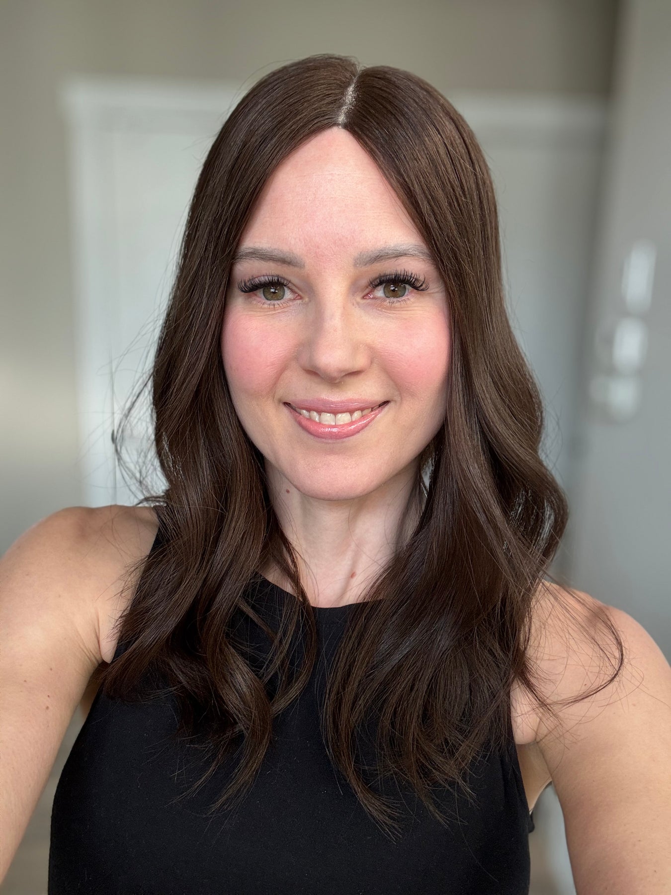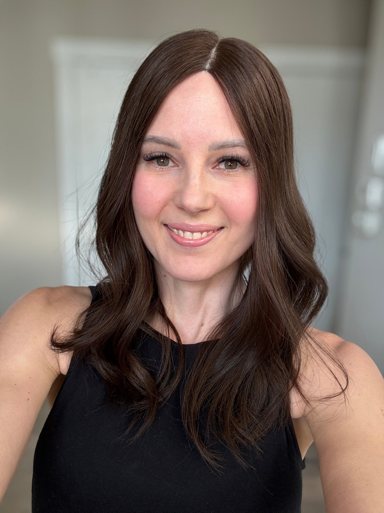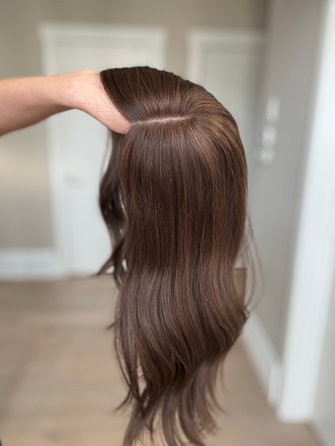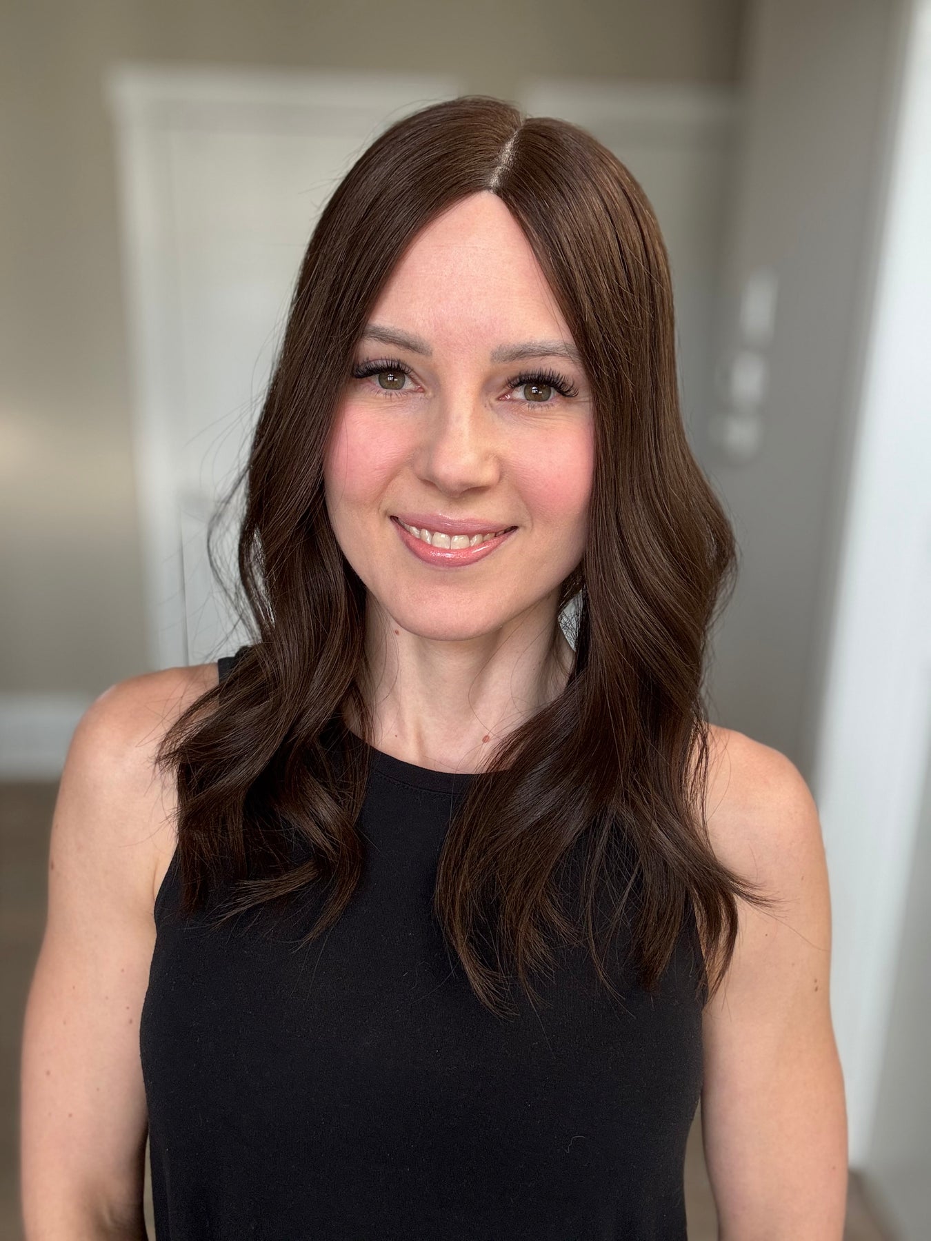 Hair Length: 19-20". We measure our toppers from the center of the crown down the side to the longest hair. Most of our toppers are layered (with the exception of the bobs/lobs) to help with movement and keep them feeling lightweight. This means the front and sides will be shorter than the back as they get longer towards the back (total measurement). Please plan accordingly.