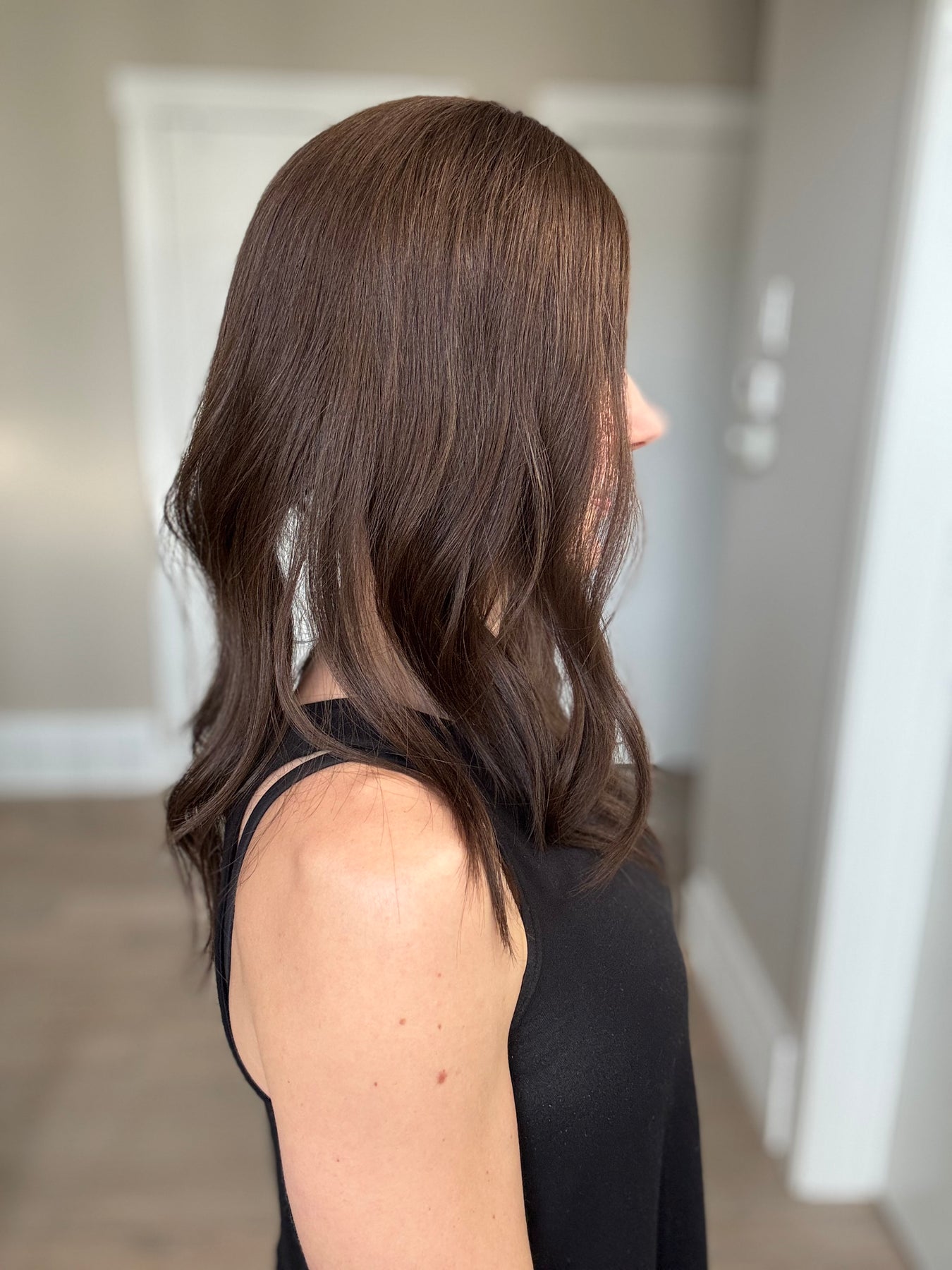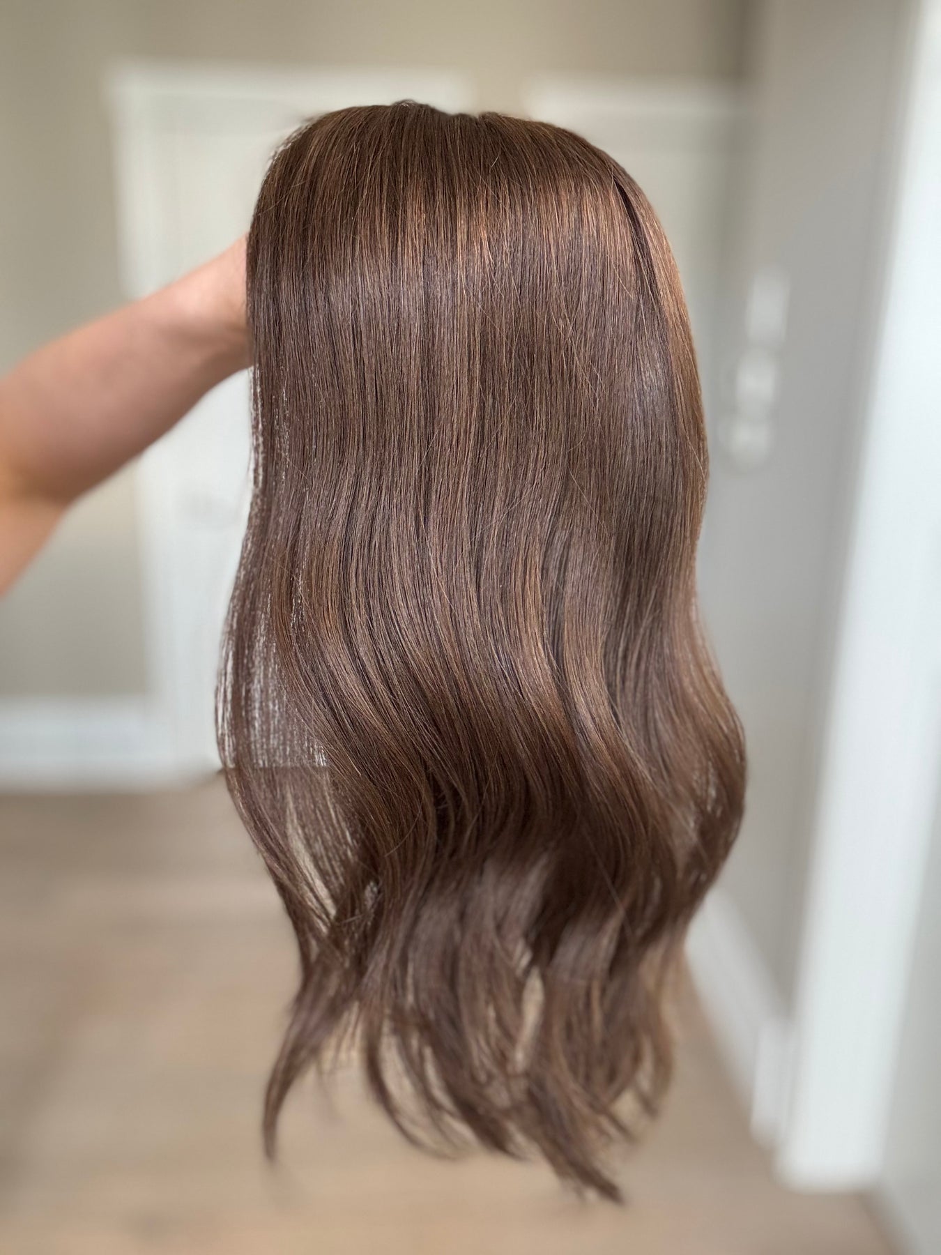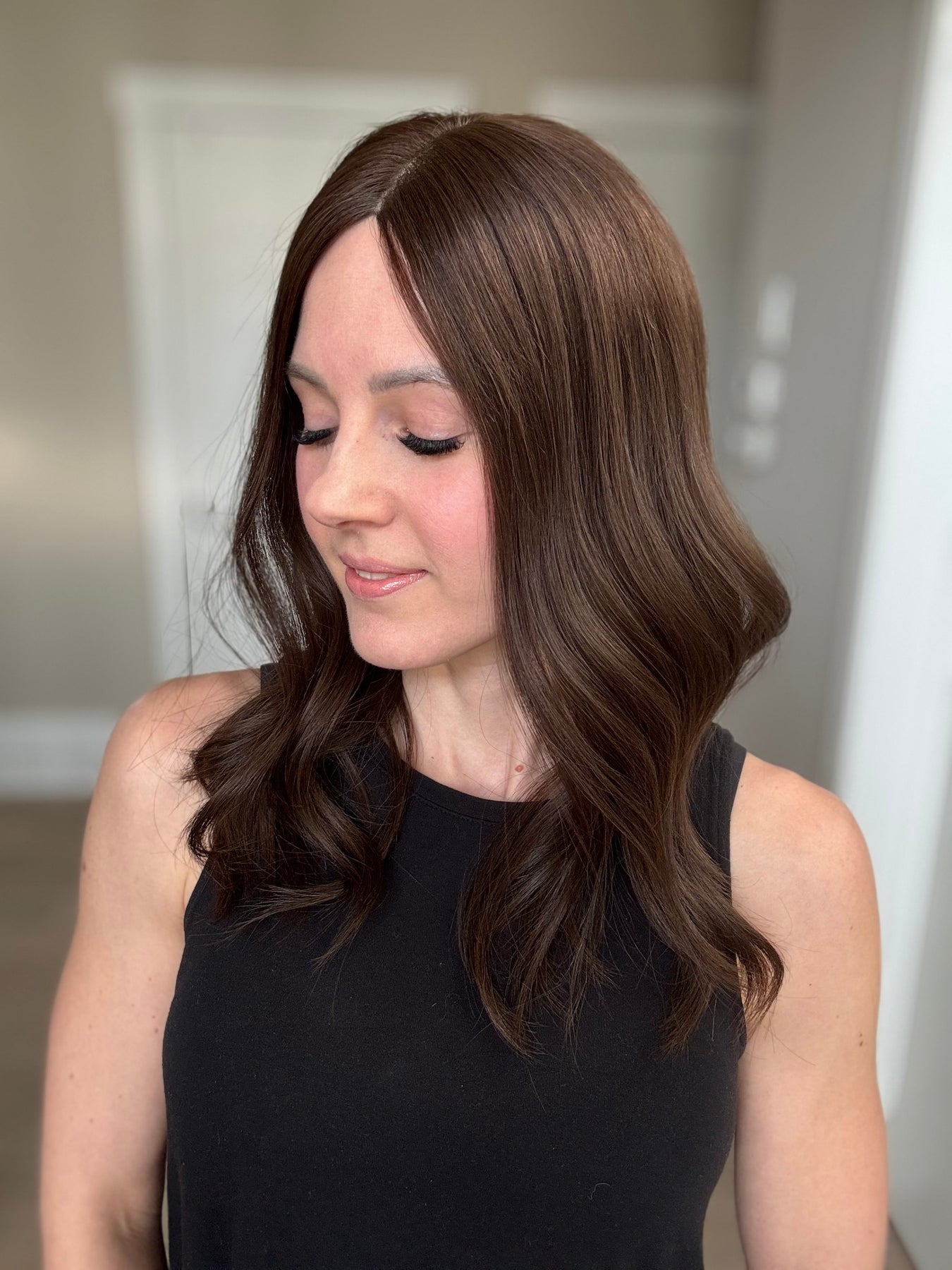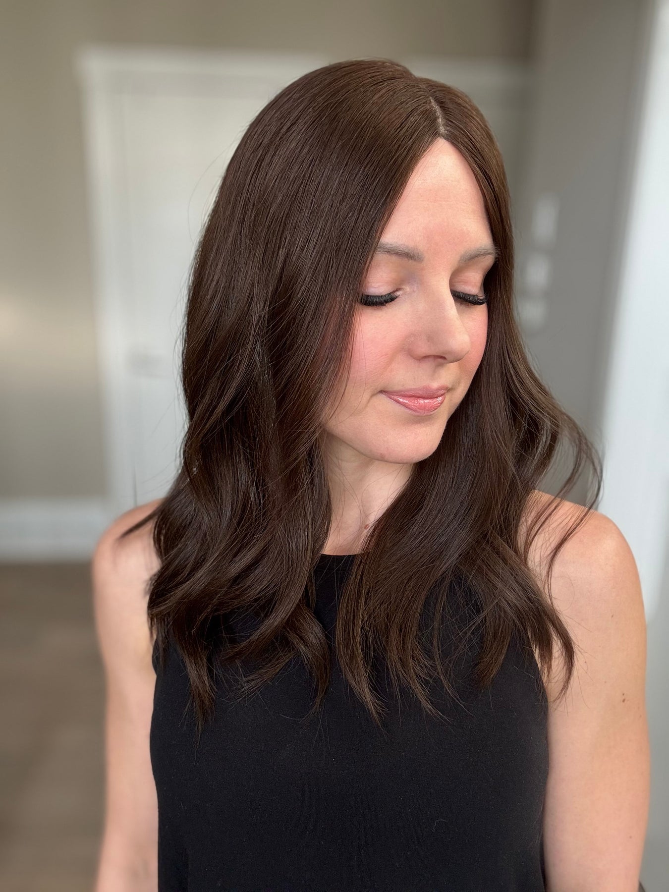 Hair Length: 19-20". We measure our toppers from the center of the crown down the side to the longest hair. Most of our toppers are layered (with the exception of the bobs/lobs) to help with movement and keep them feeling lightweight. This means the front and sides will be shorter than the back as they get longer towards the back (total measurement). Please plan accordingly.