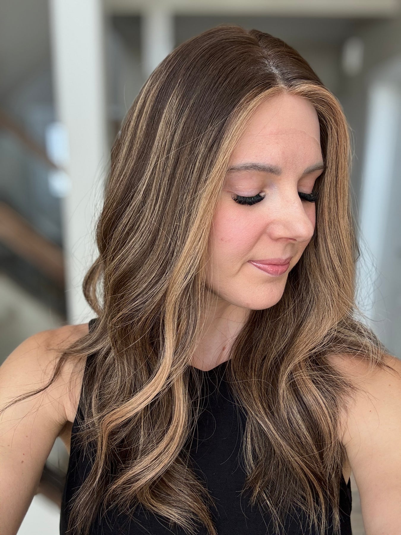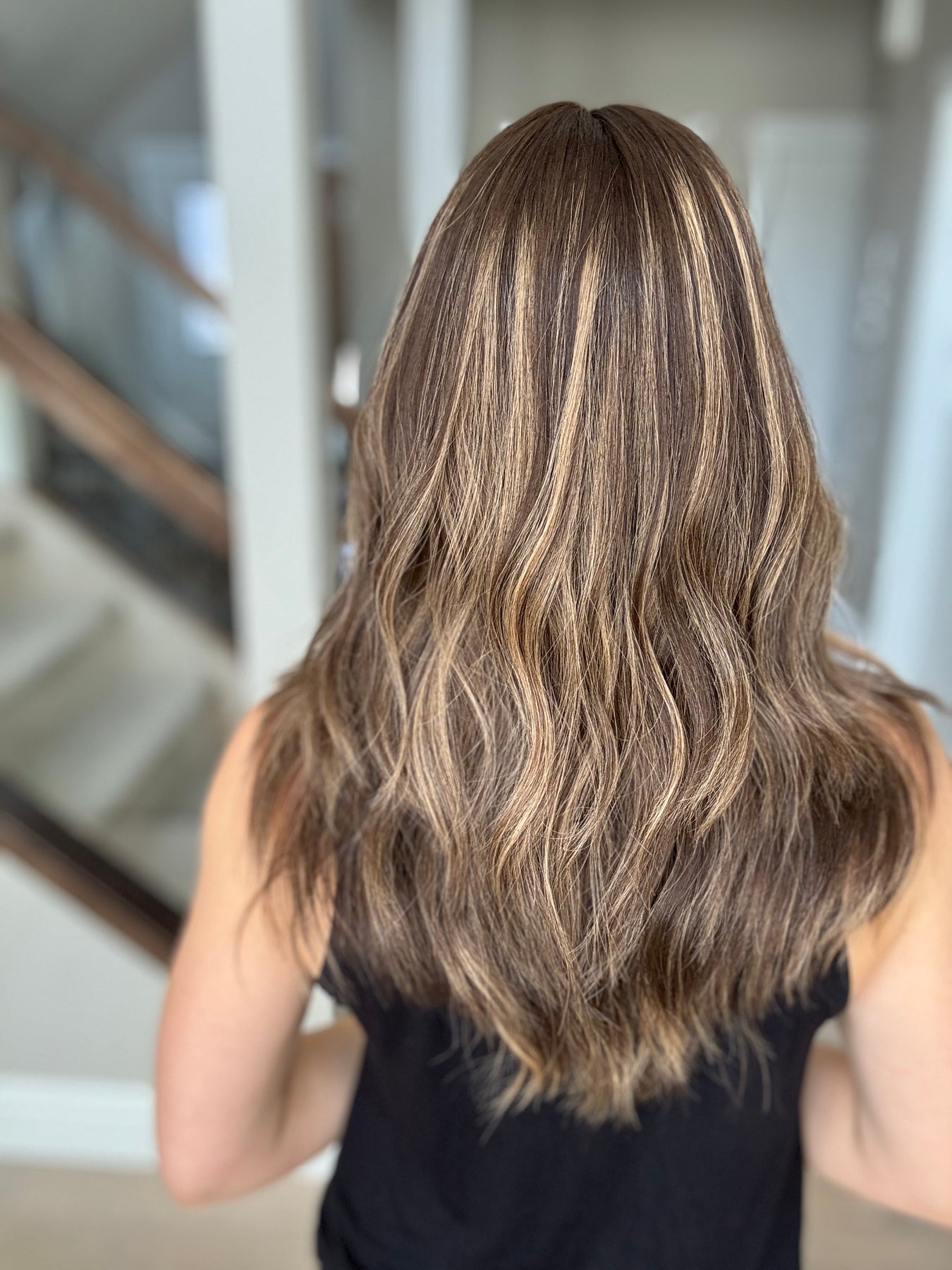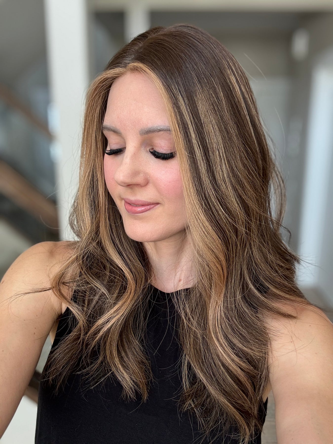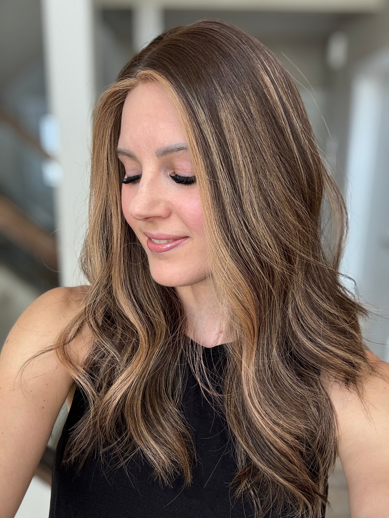 * Color: Dark brown with light caramel balayage and front money pieces.