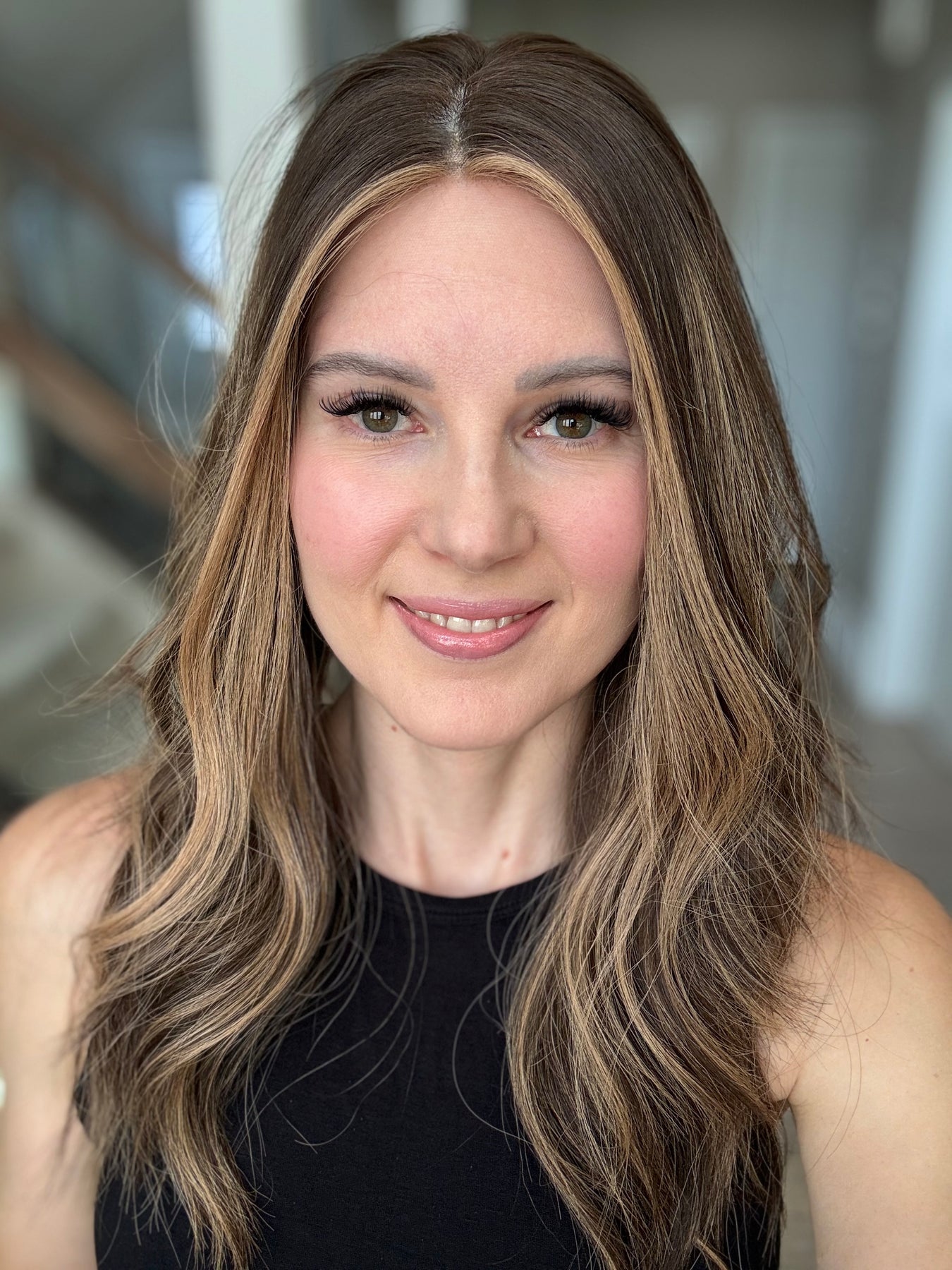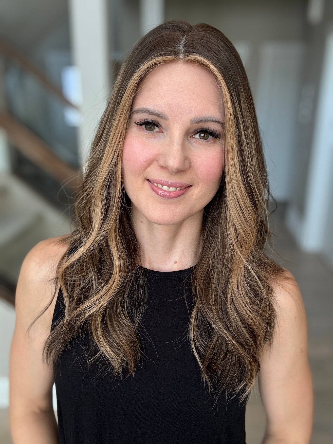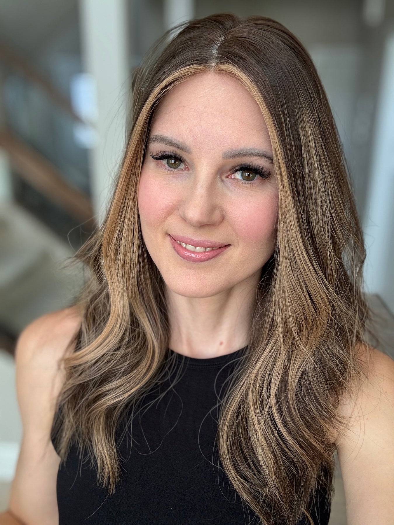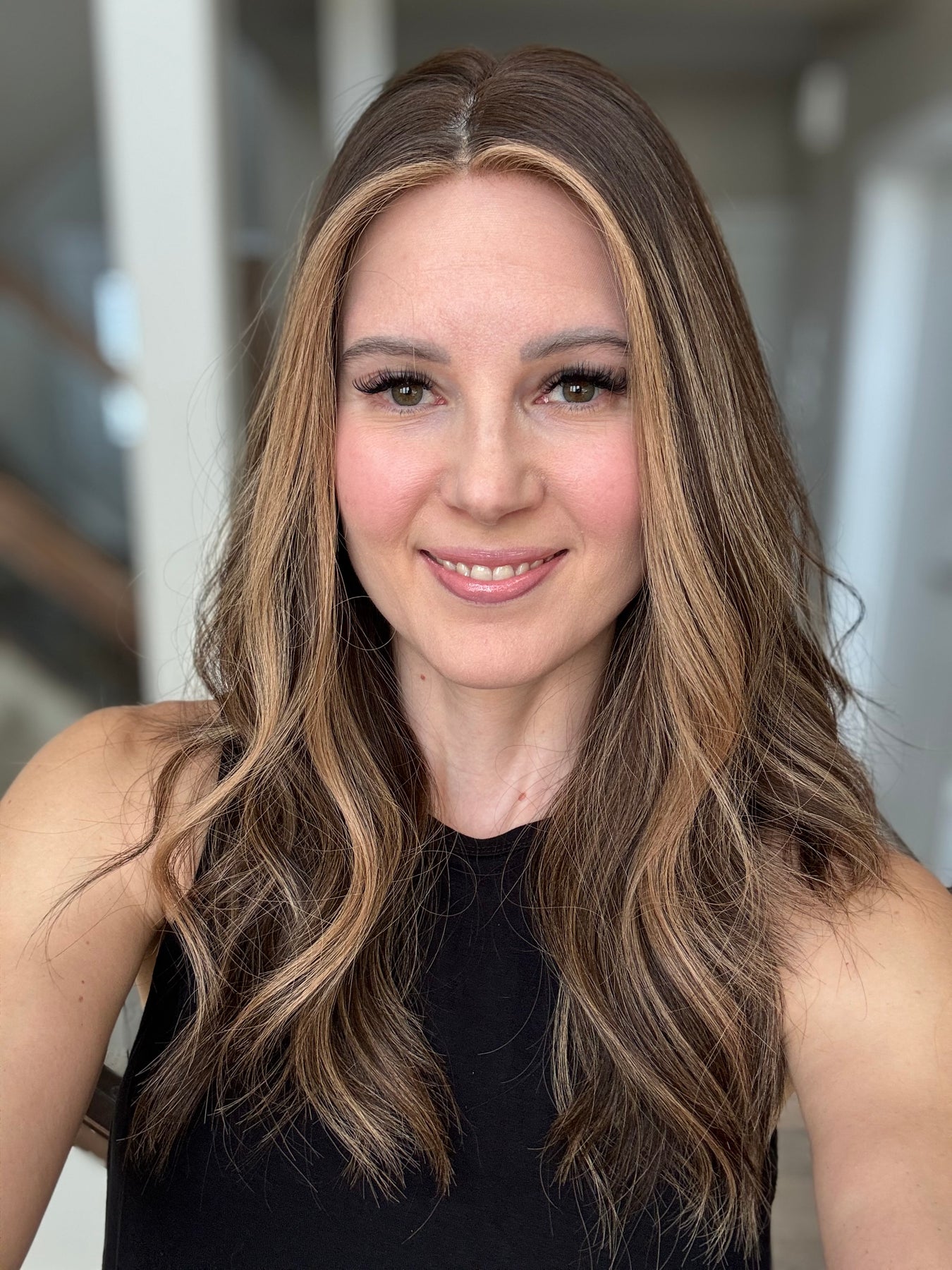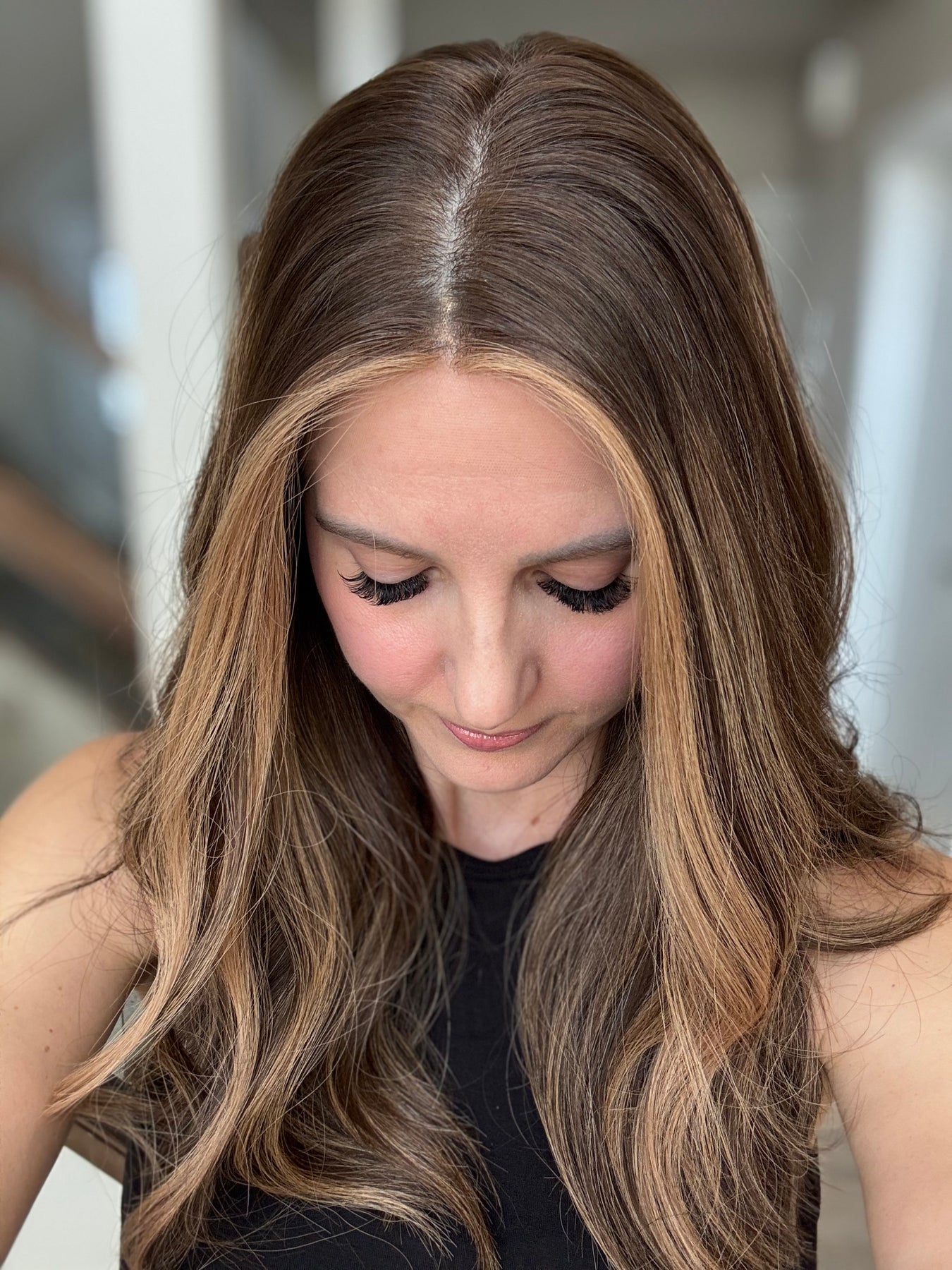 * Color: Dark brown with light caramel balayage and front money pieces.