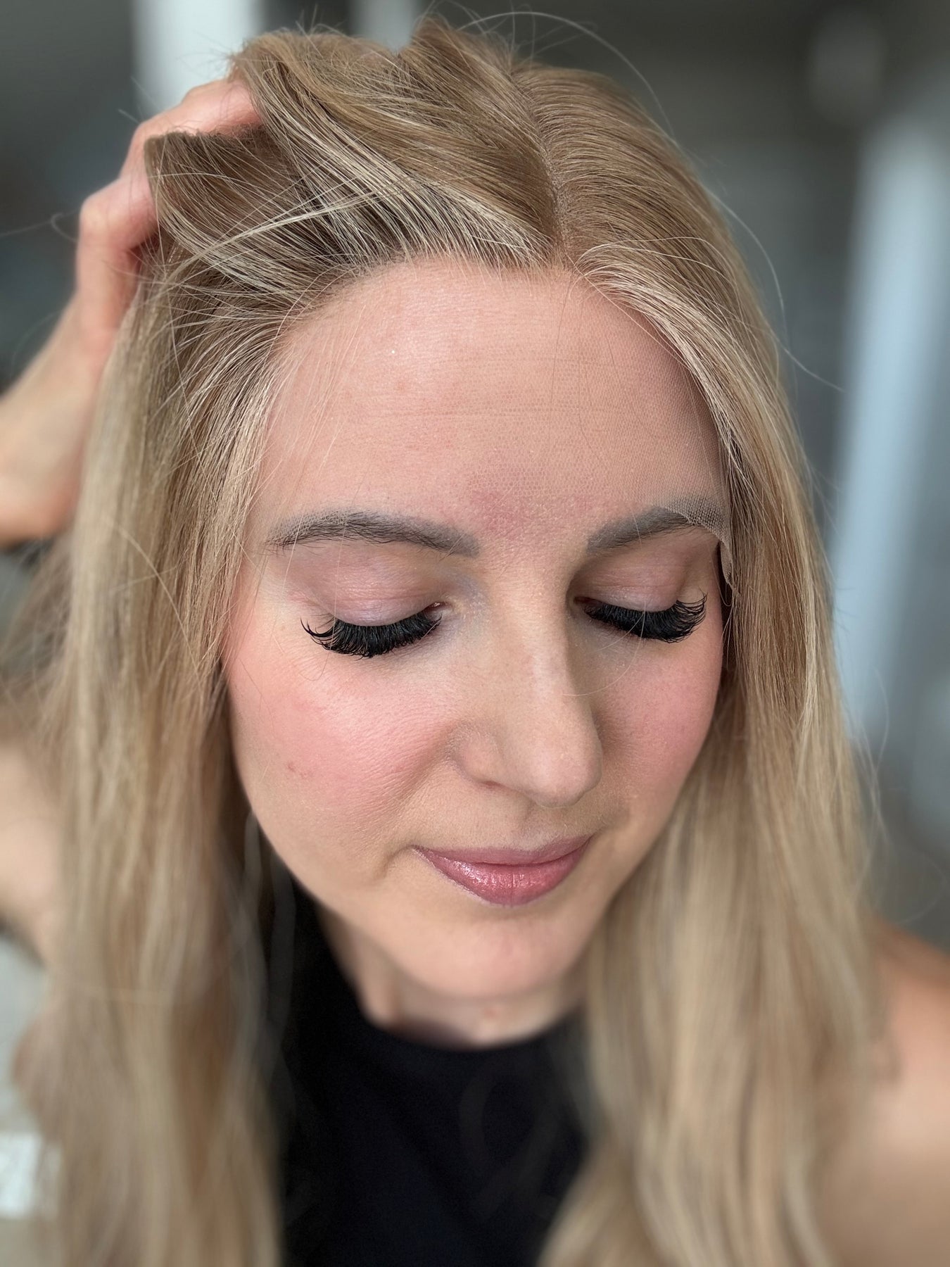 * Please note wig is shown with a small amount of face powder dabbed into the part-line for demonstration purposes. We recommend clients use powder rather than bleaching the knots as it extends the longevity of the wig and often looks more realistic.