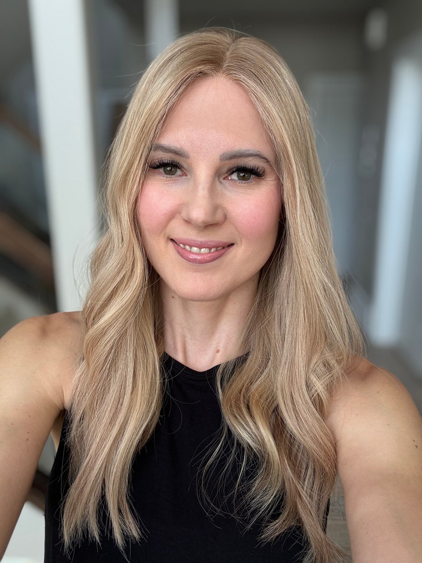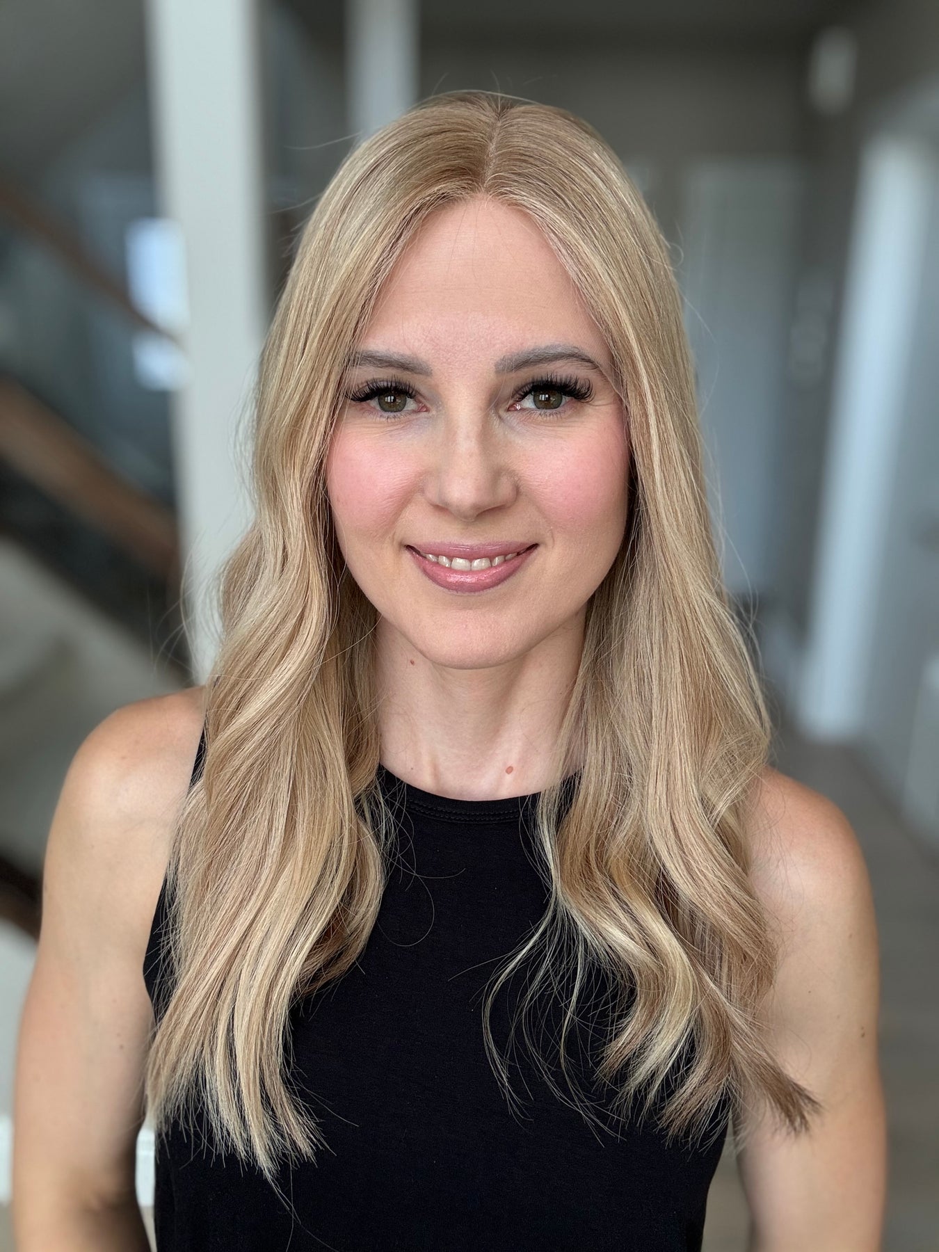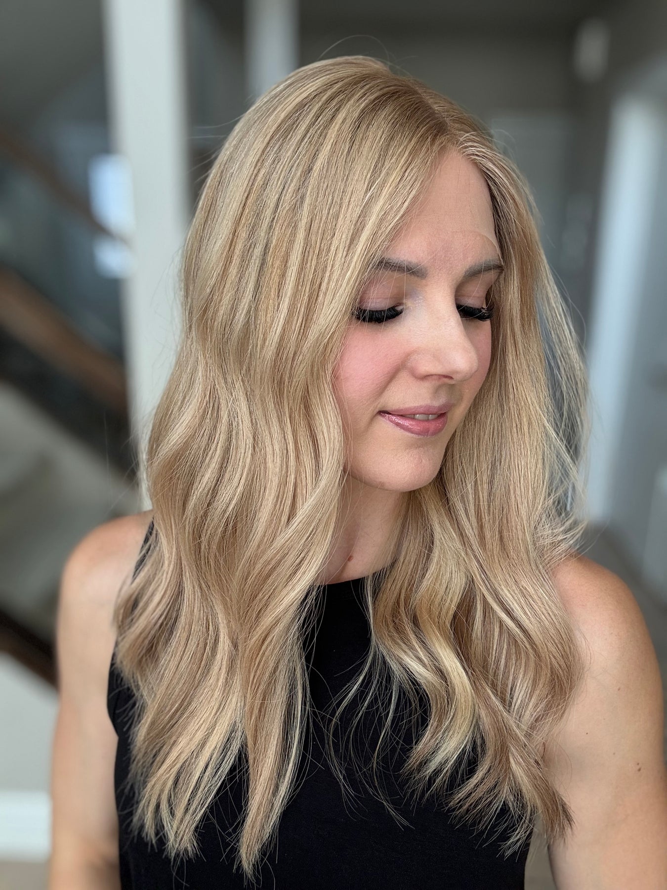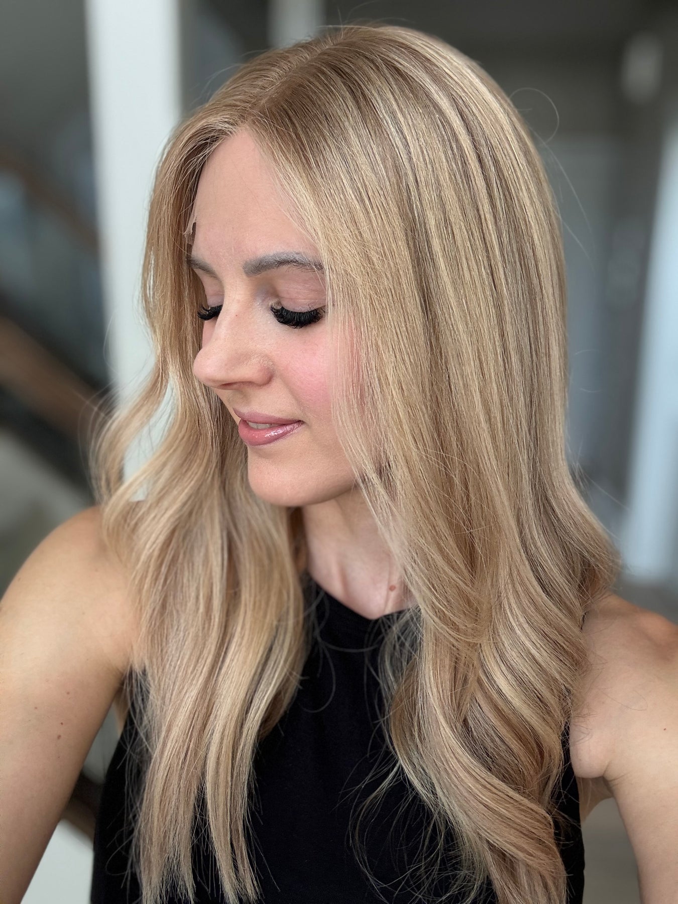 * Color: Soft warm baby blonde with darker warm blonde roots and dimension.