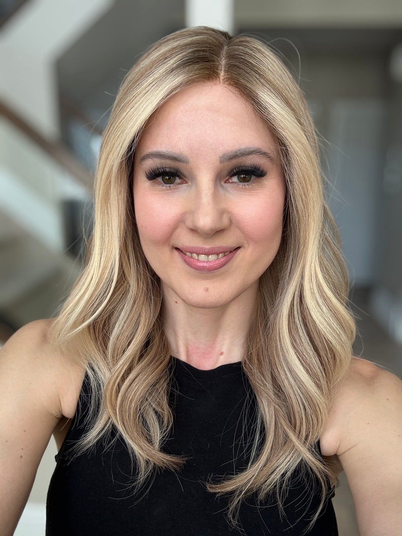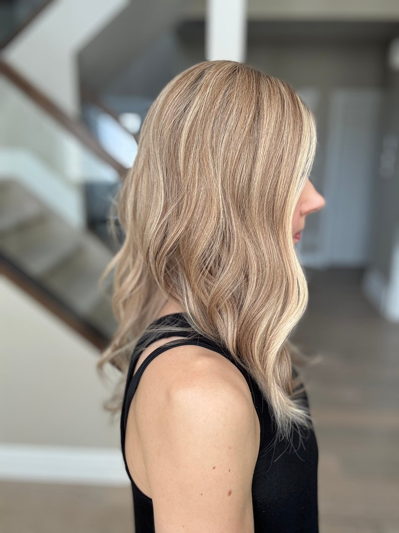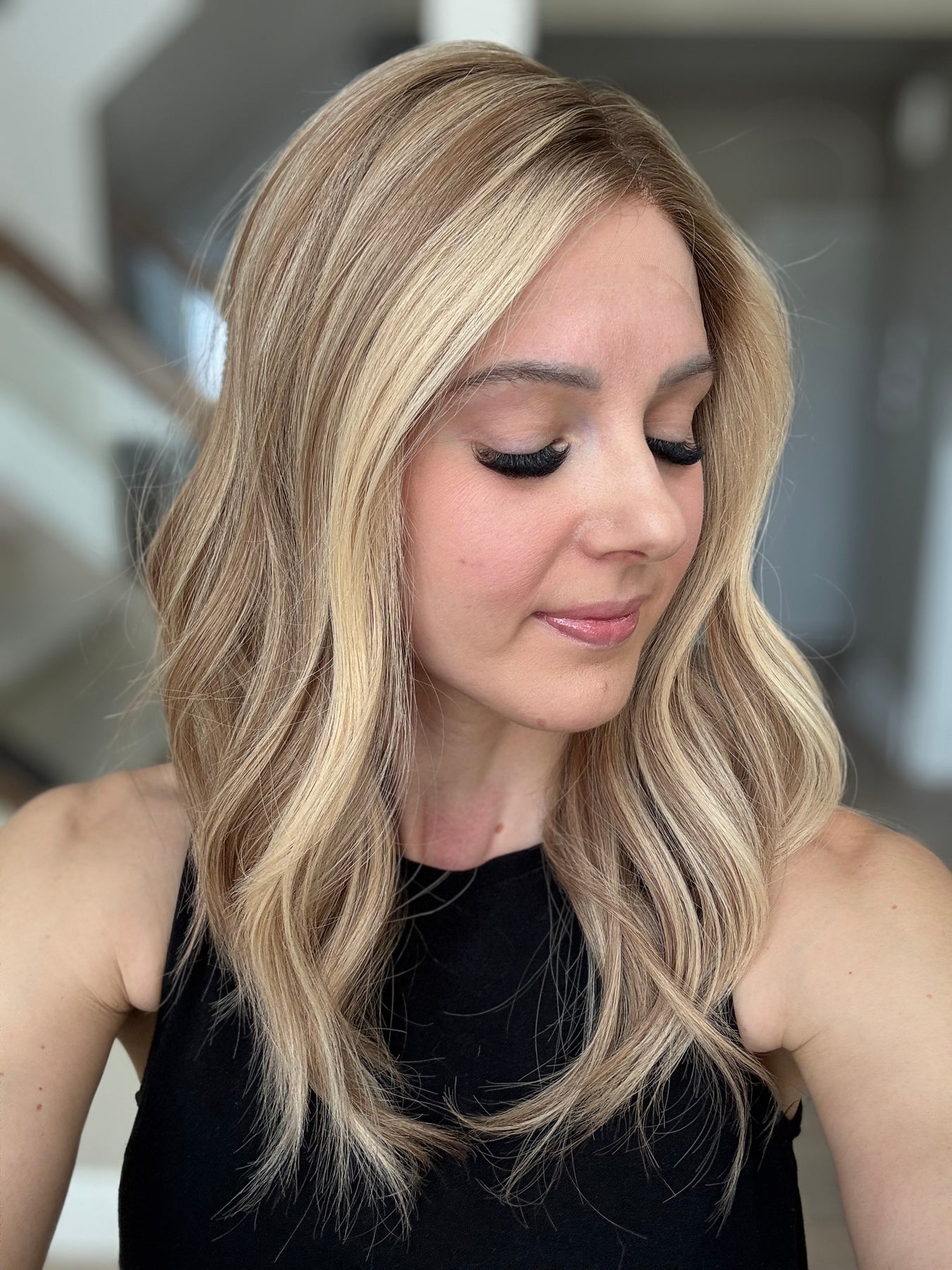 * Color: Dimensional neutral to warm blonde with a medium brown shadow root.