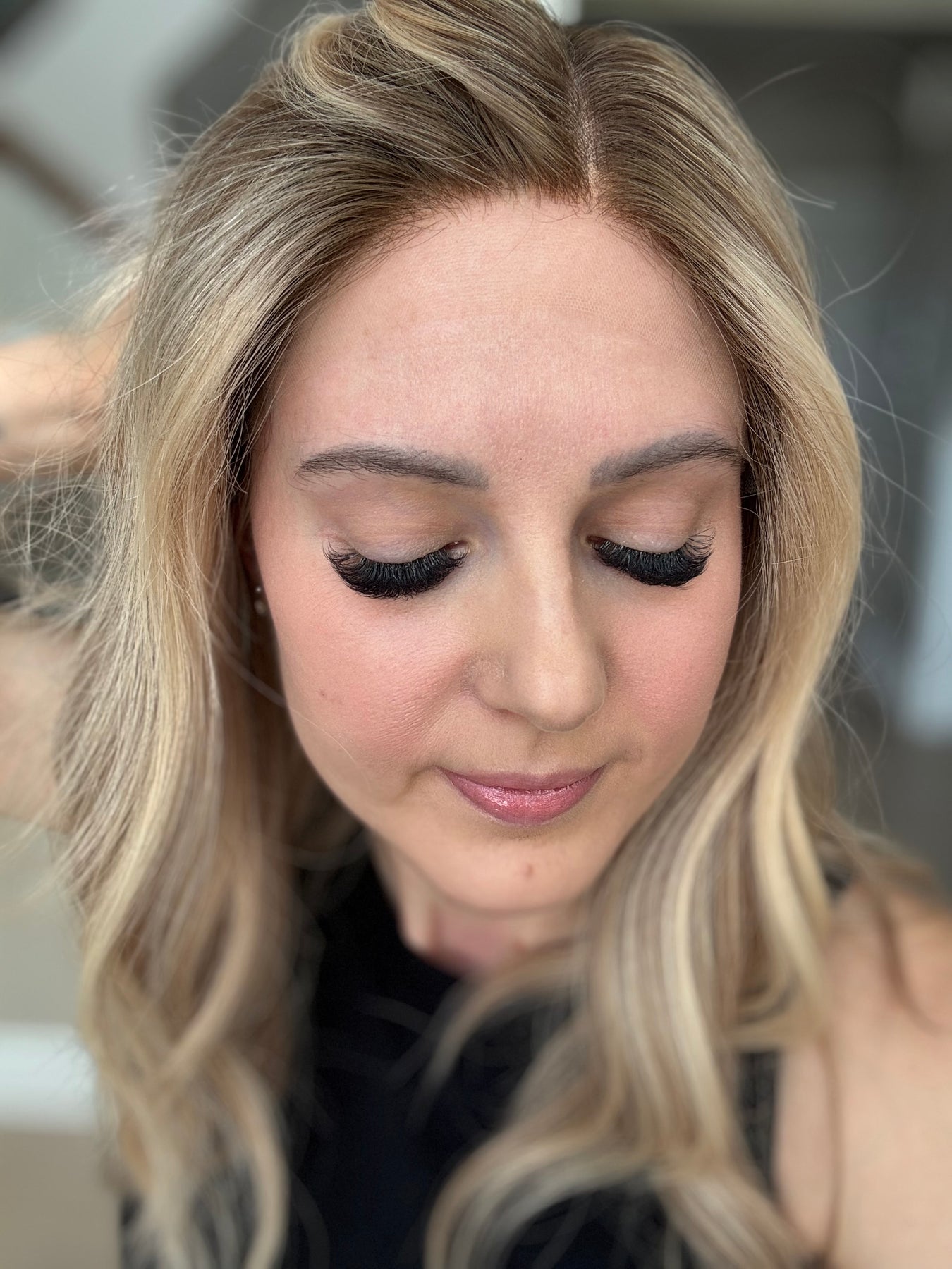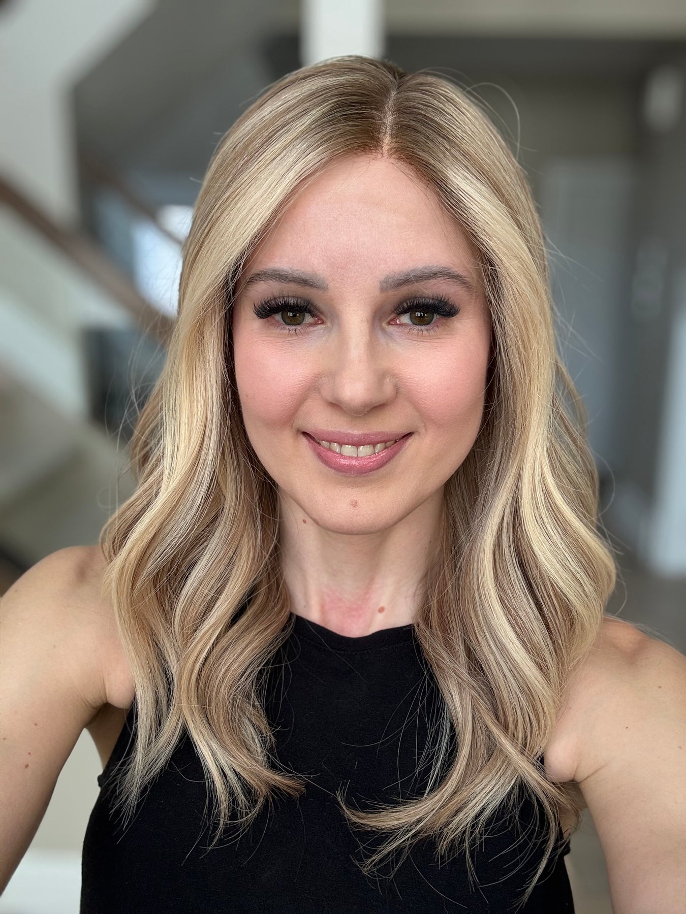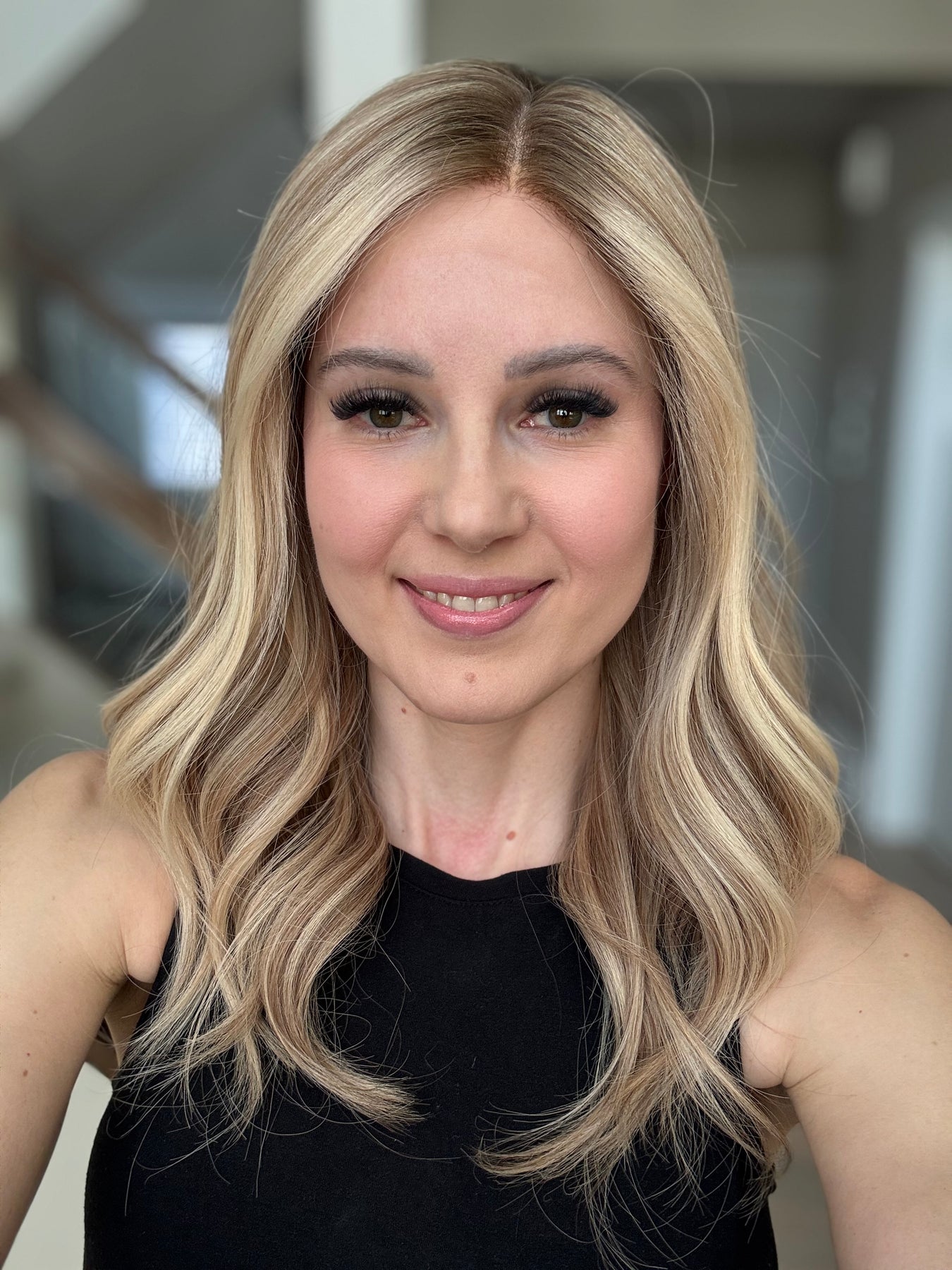 * Color: Dimensional neutral to warm blonde with a medium brown shadow root.