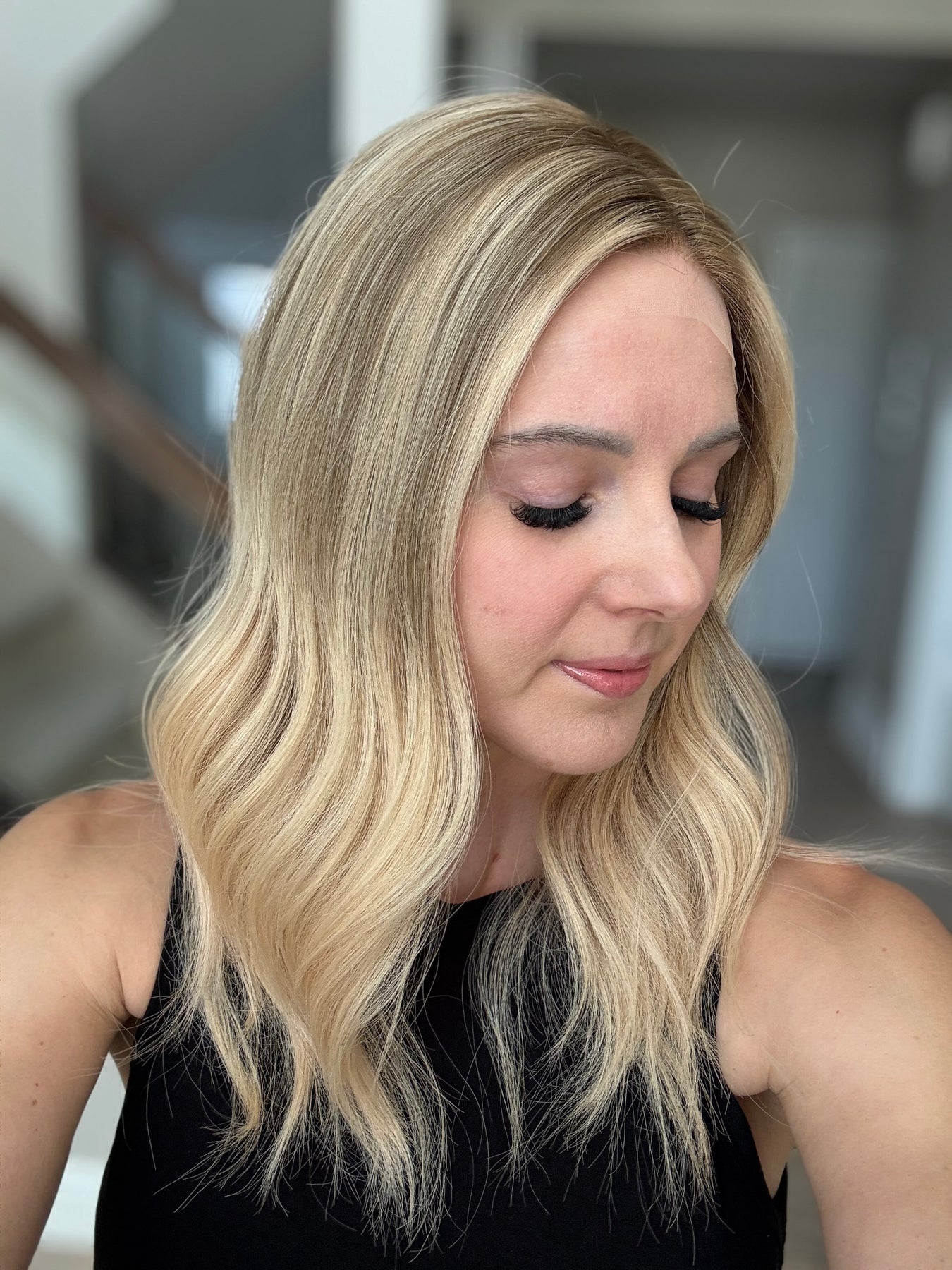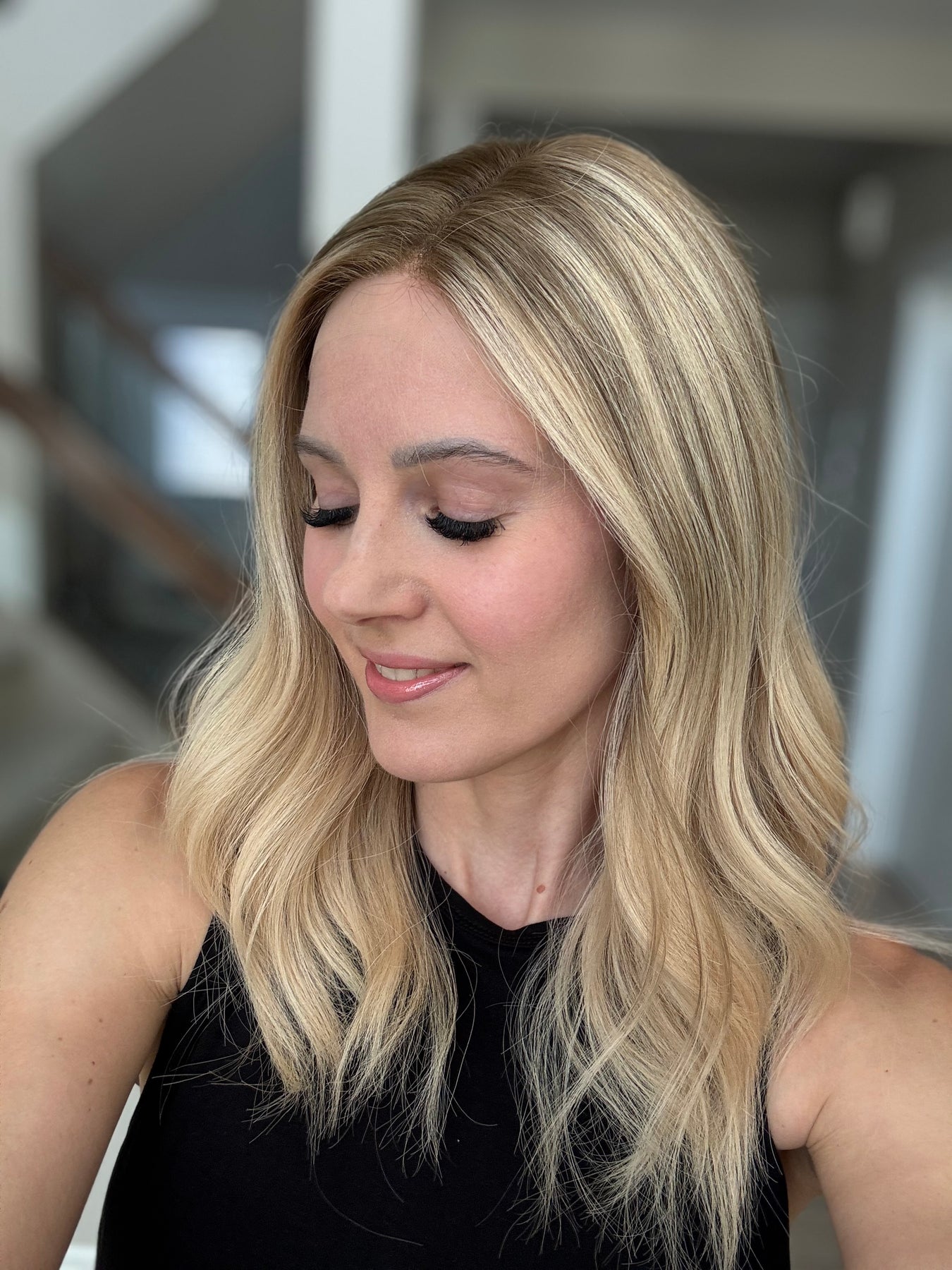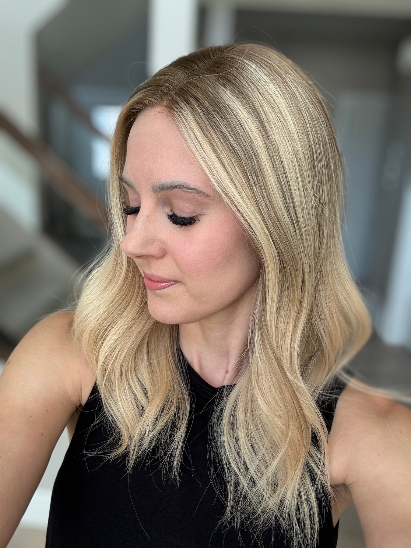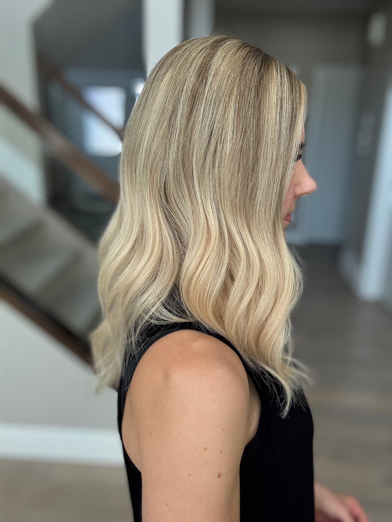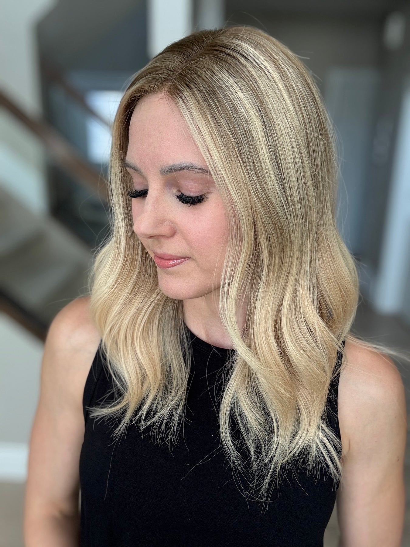 * Color: Light warm dimensional blonde with a subtle root and lowlights.