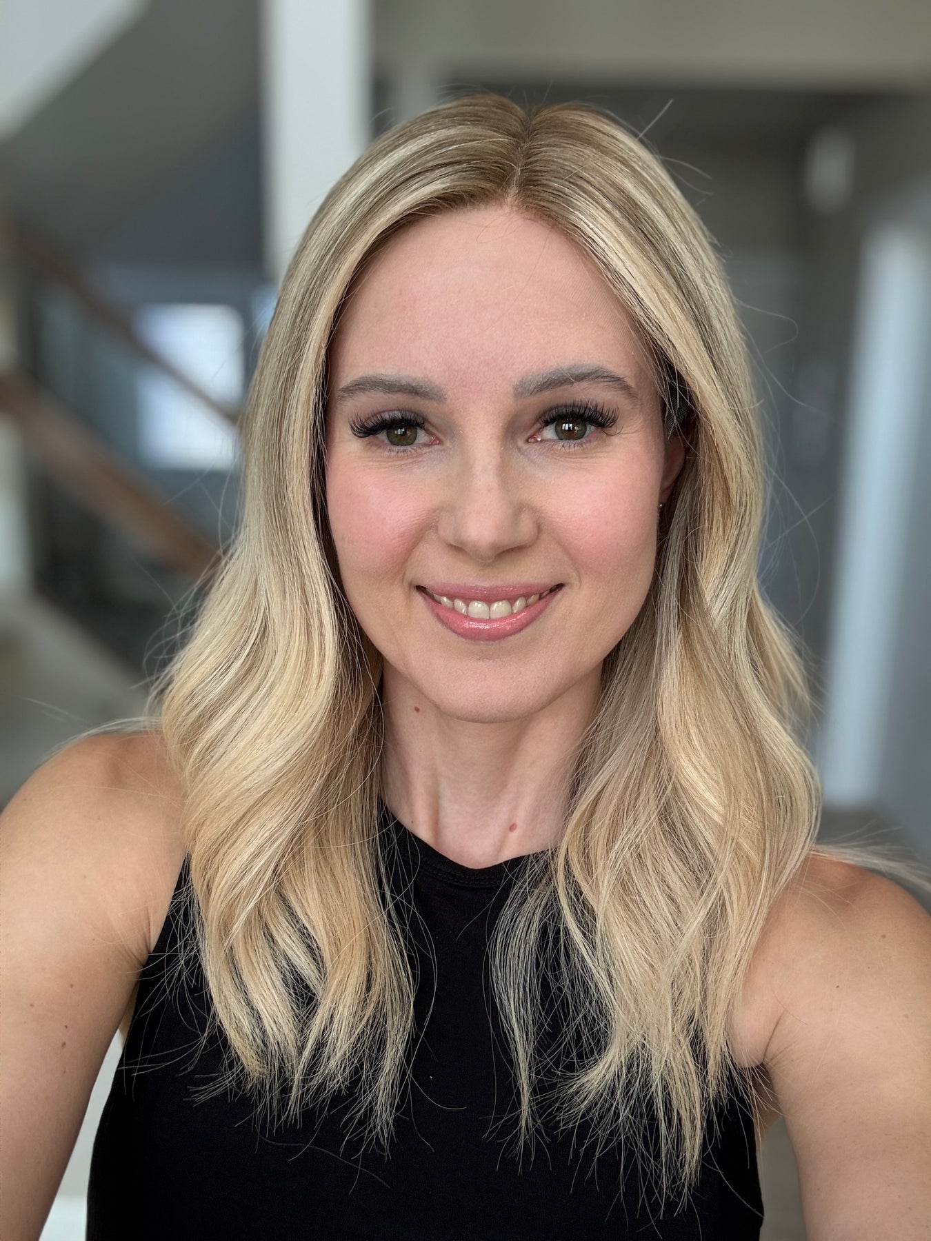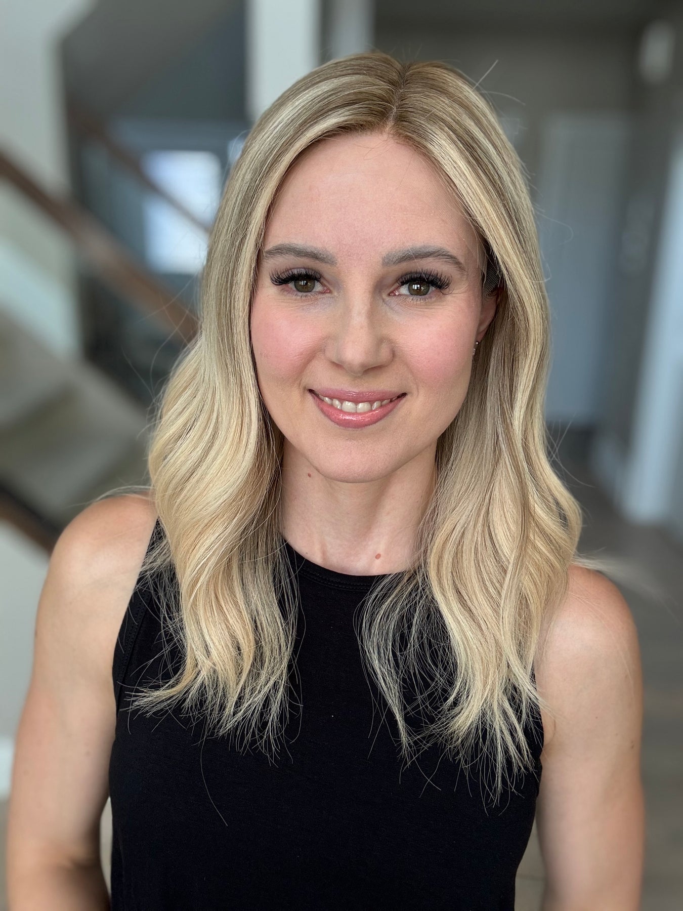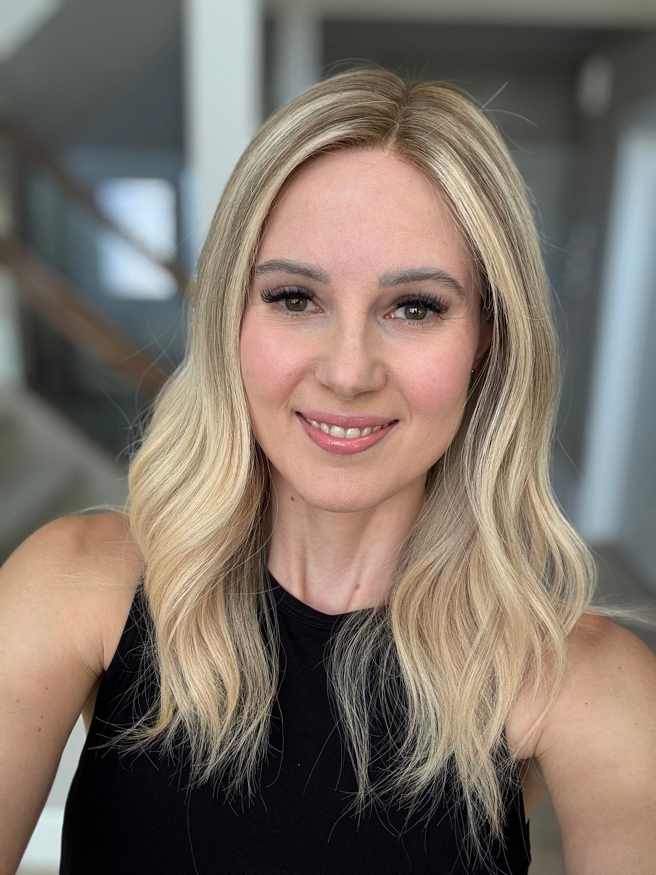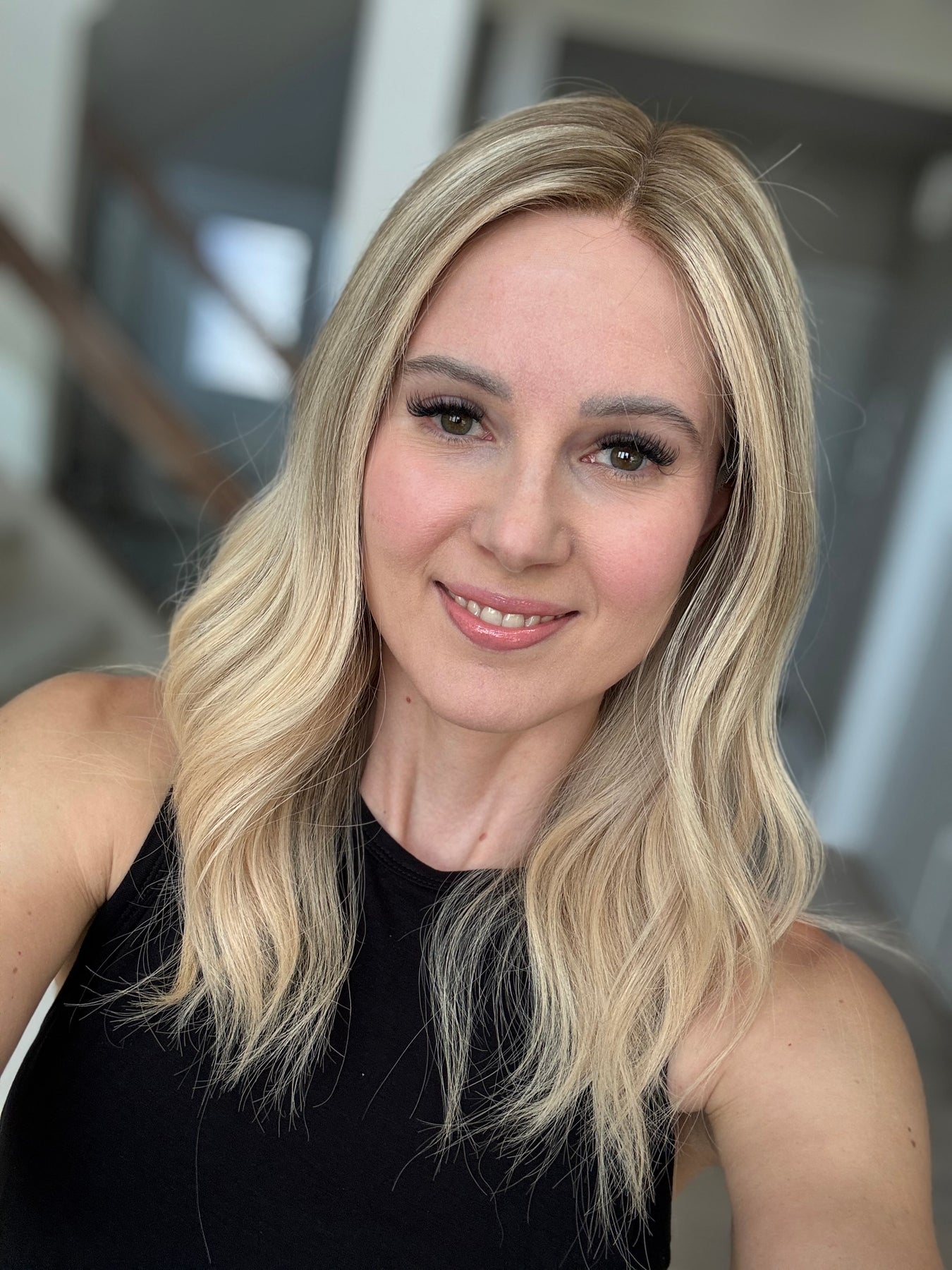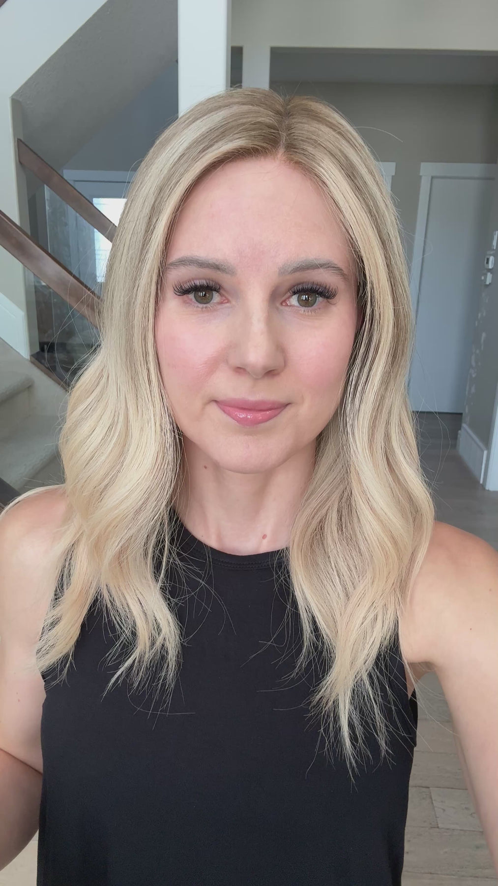 * Color: Light warm dimensional blonde with a subtle root and lowlights.