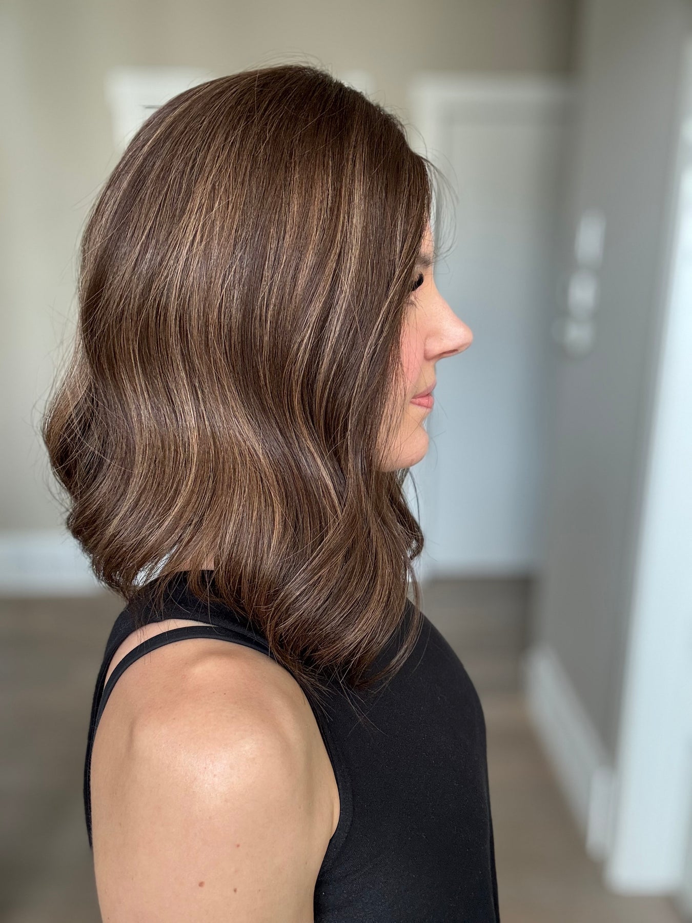 Color: Dark brown with caramel balayage.