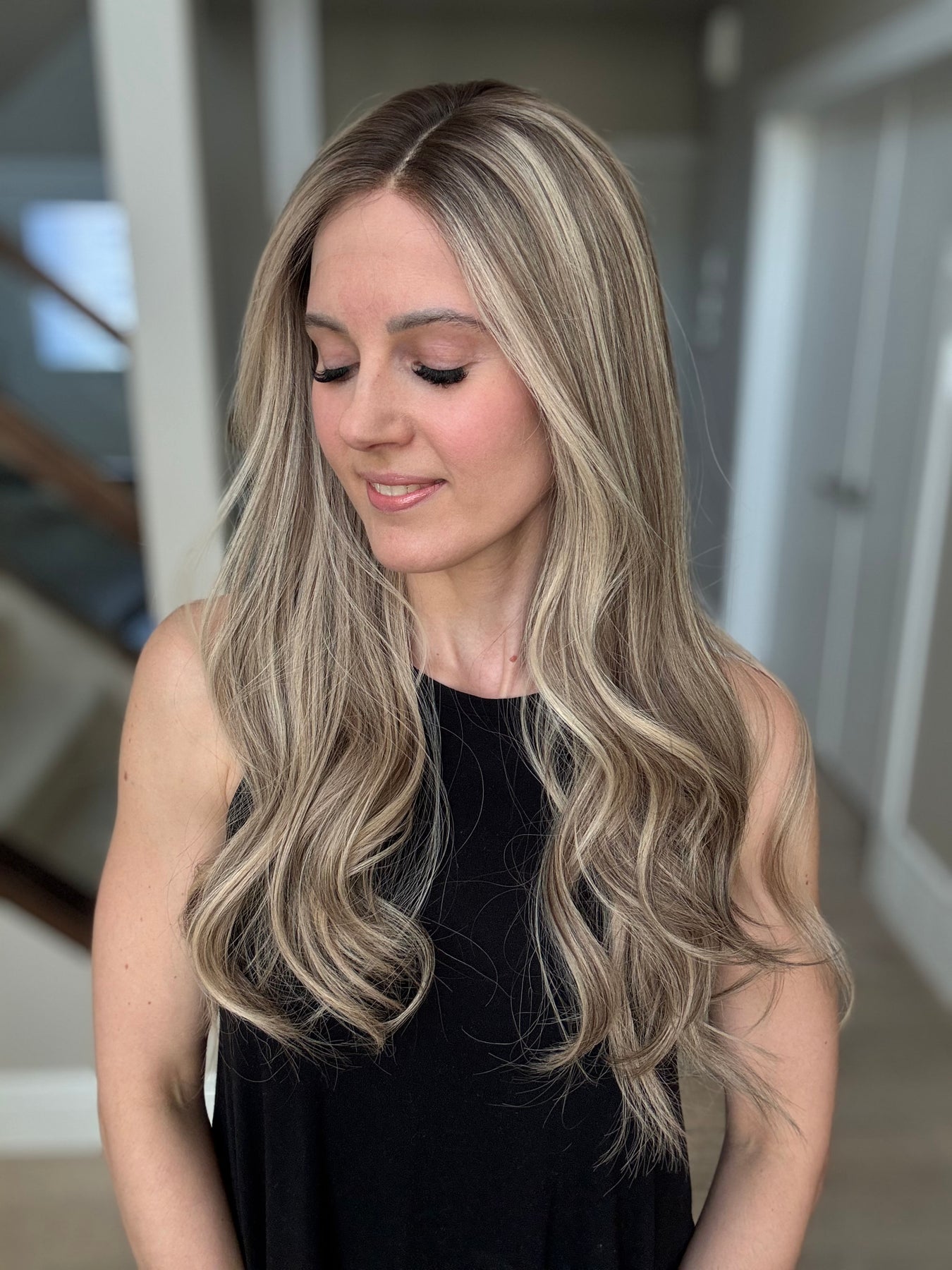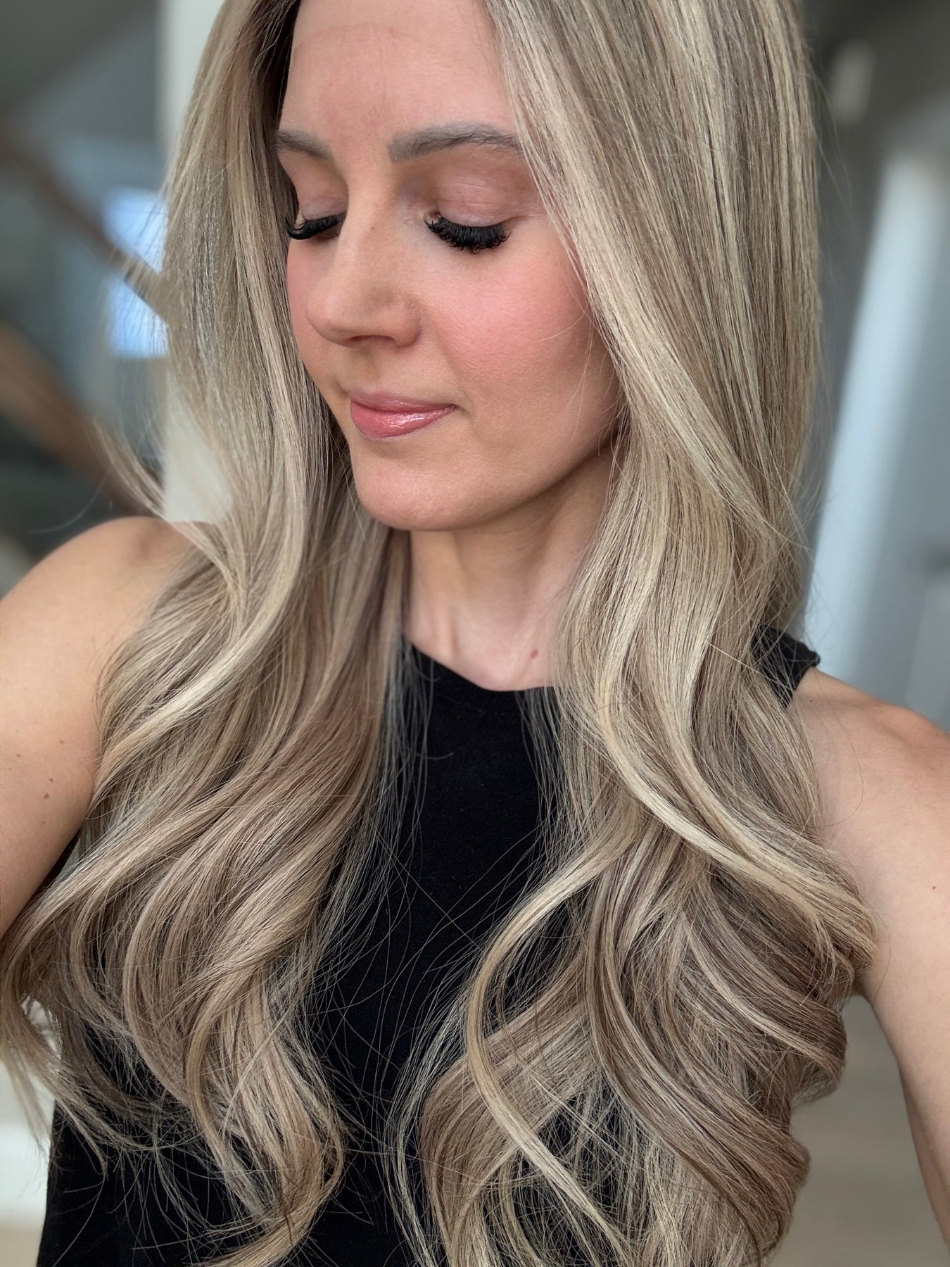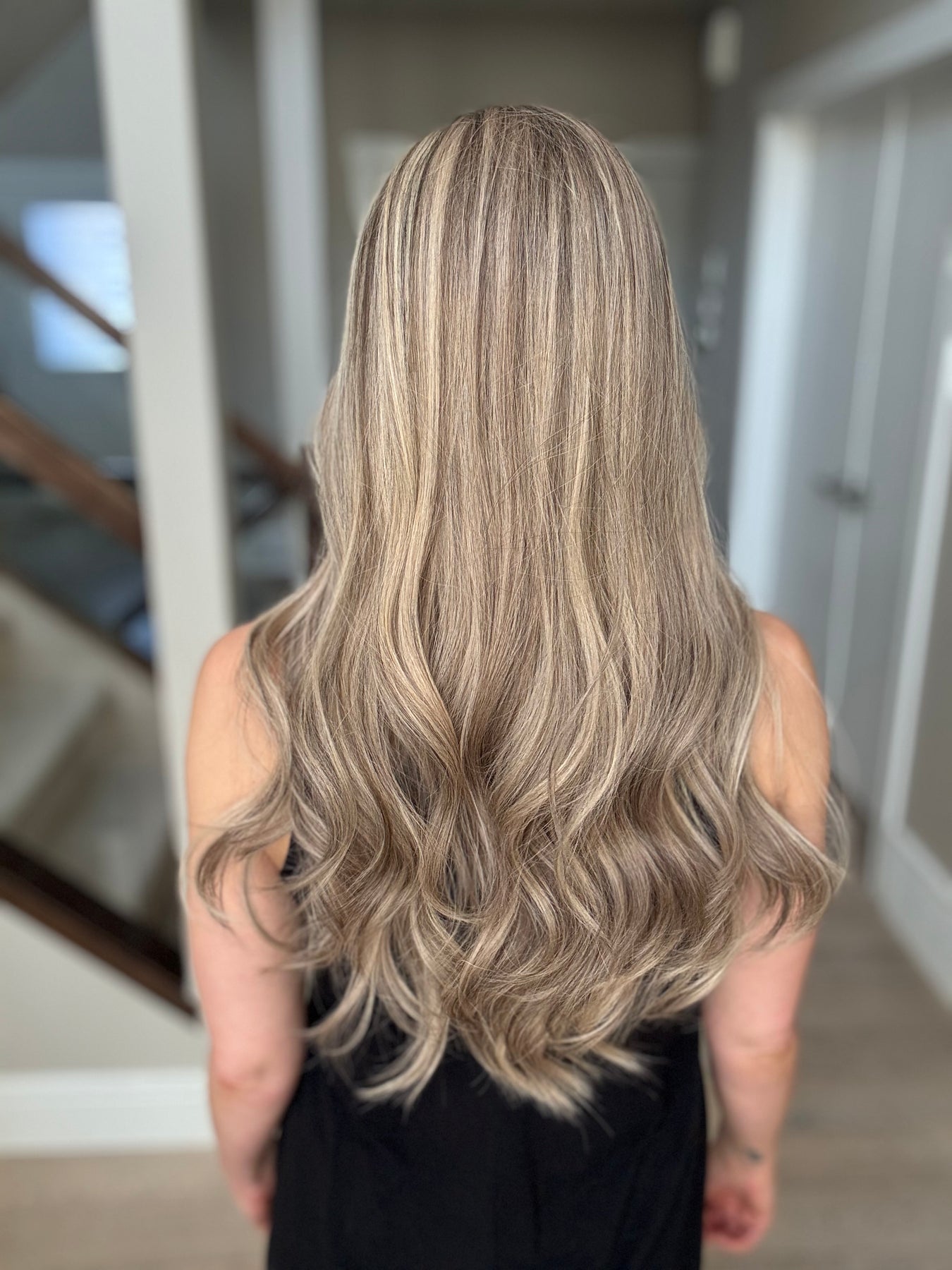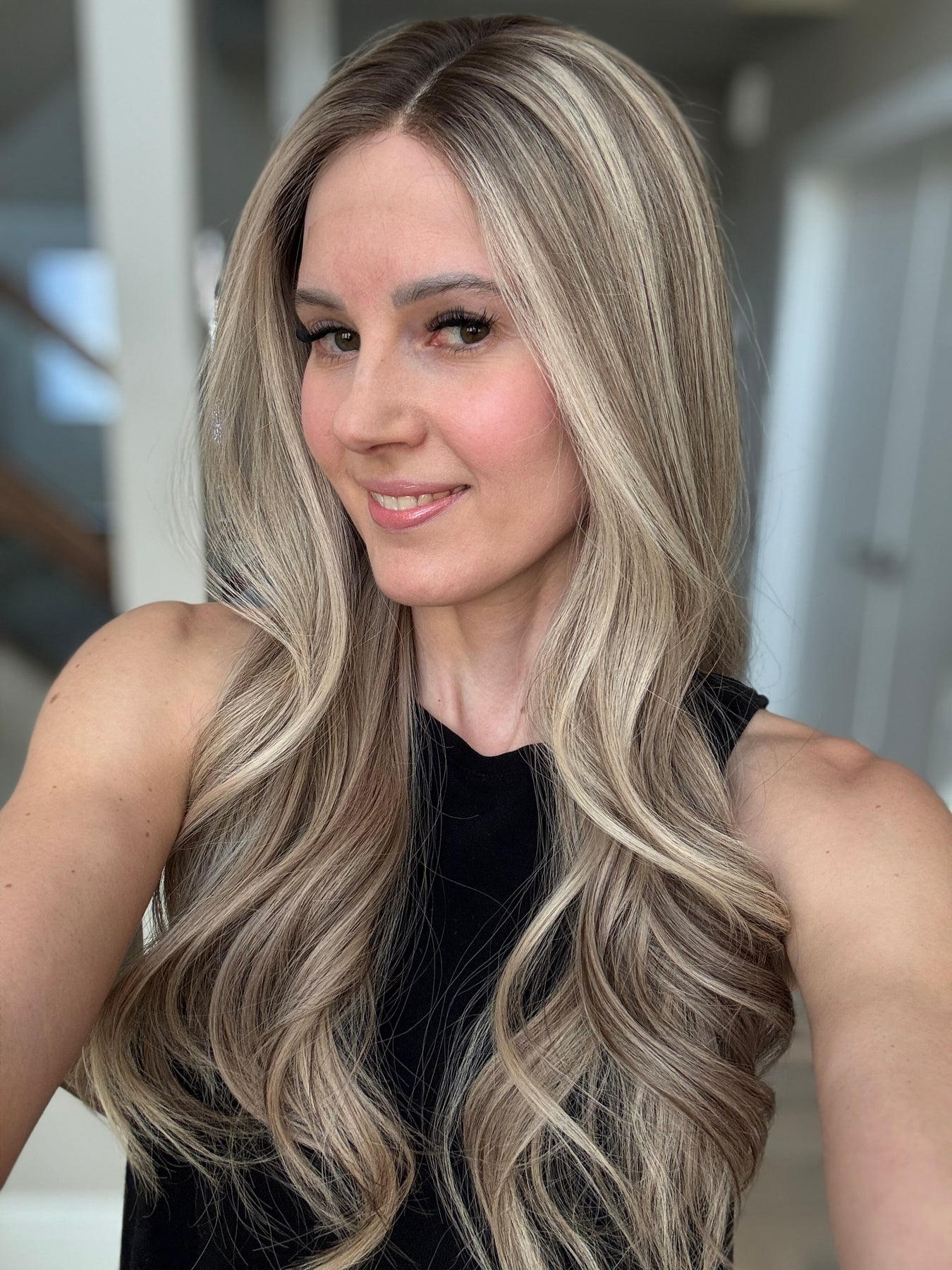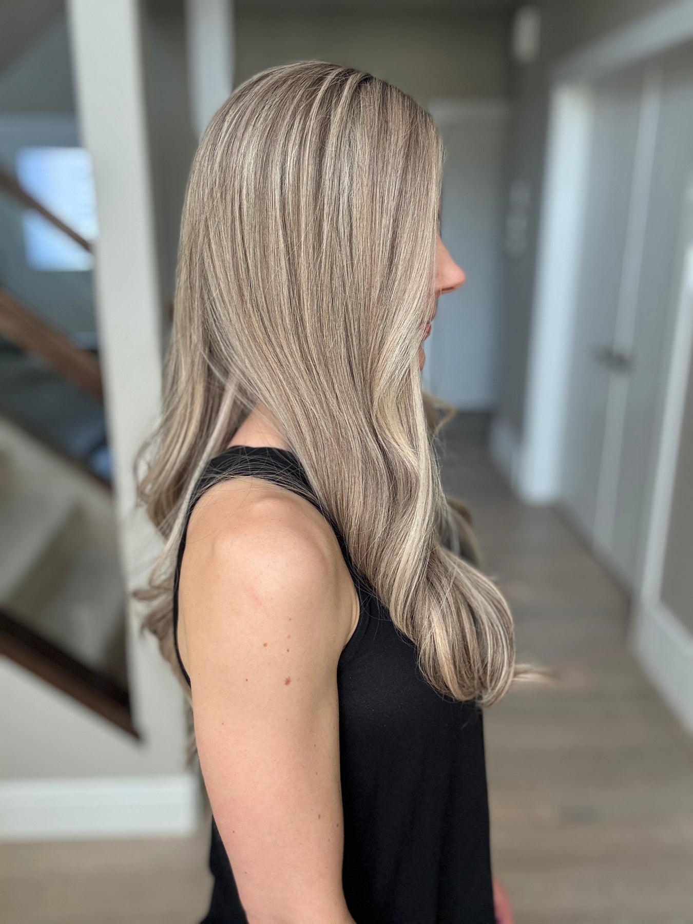 * Color: Cool light blonde with lots of ashy dimension and a light neutral brown root.