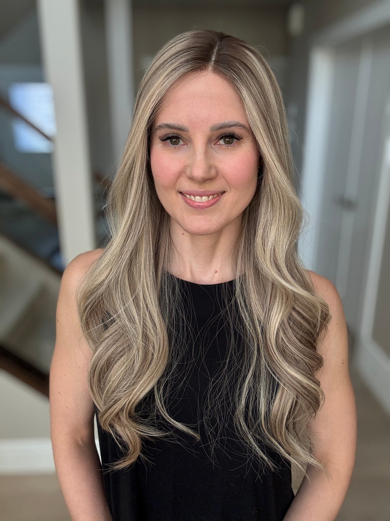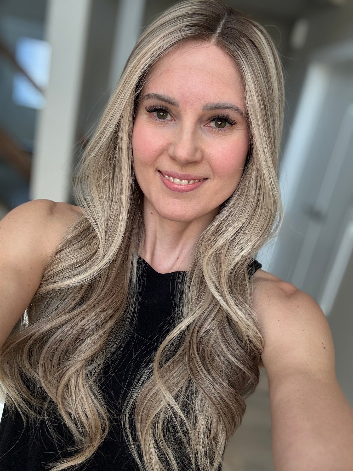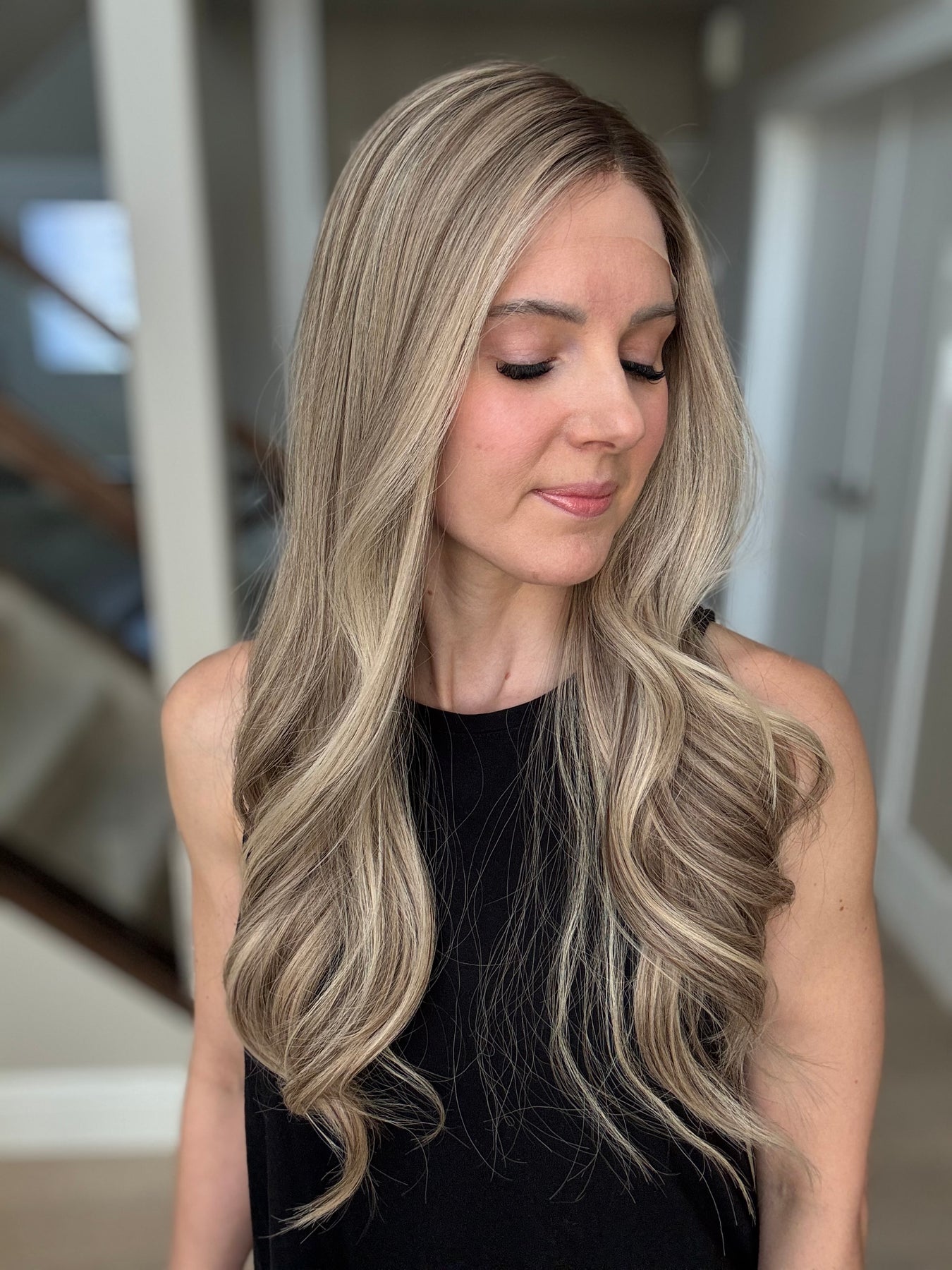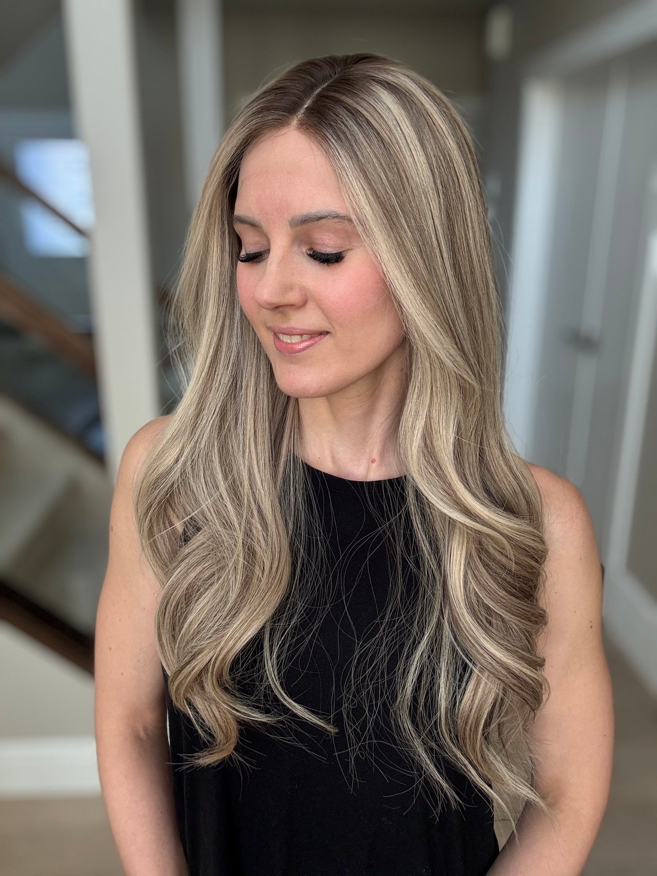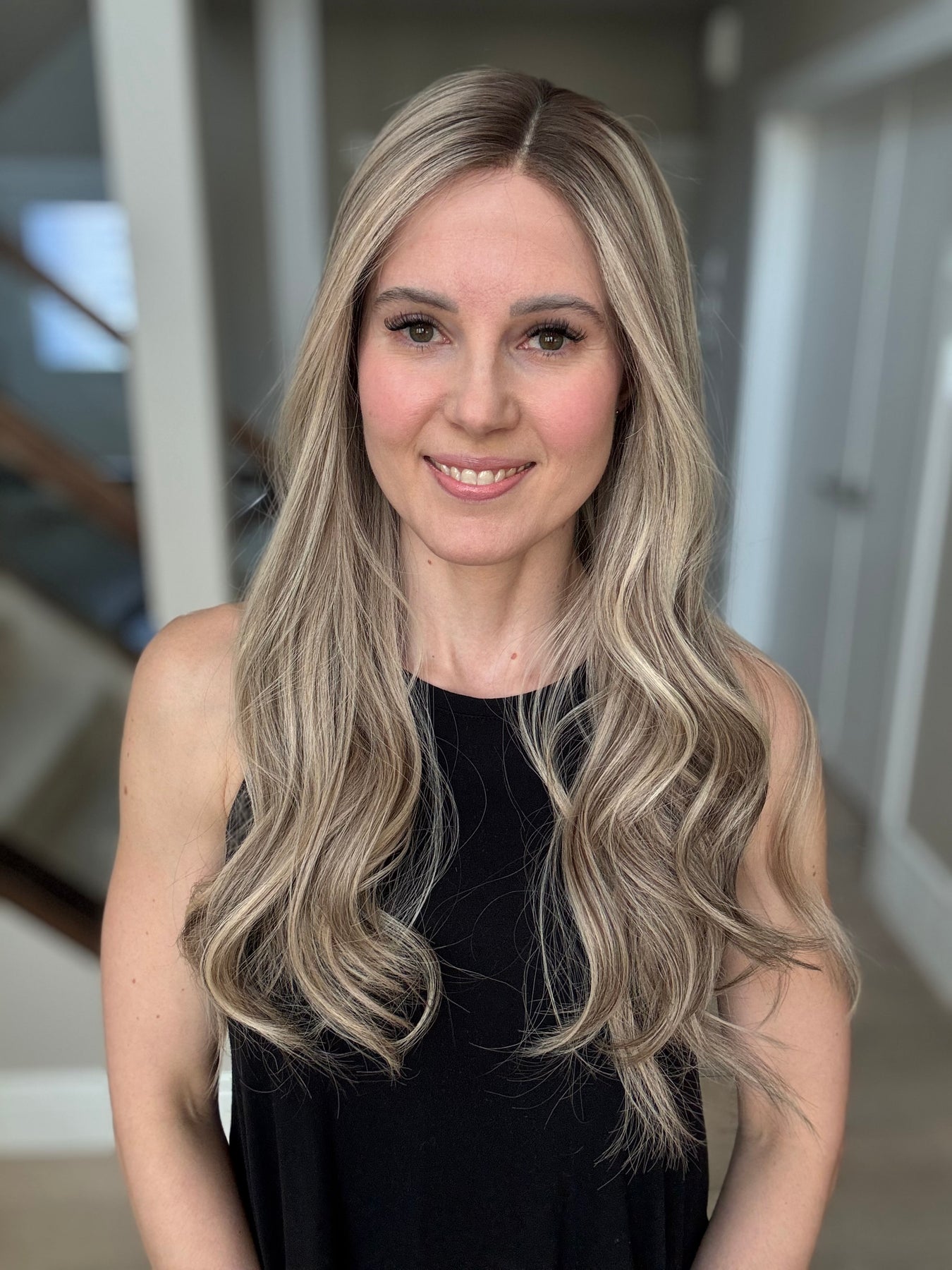 * Color: Cool light blonde with lots of ashy dimension and a light neutral brown root.